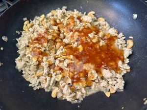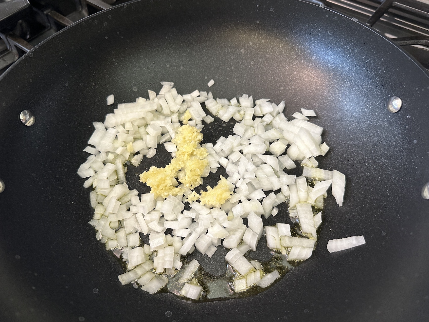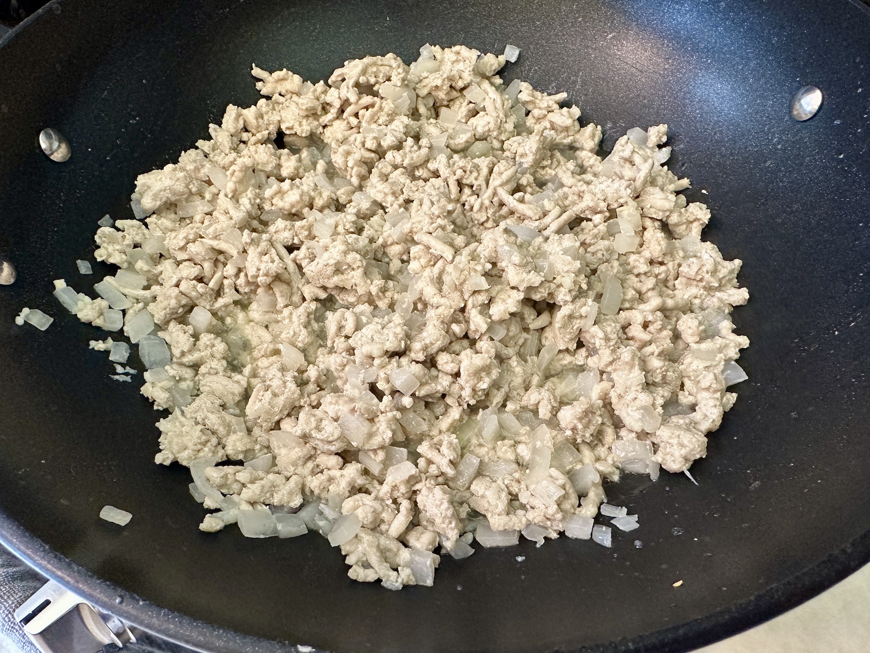 Start by heating oil in a skillet over medium heat. Add the onion and garlic and cook until the onions are translucent, and the garlic is fragrant, about 2 minutes. Then, add the ground chicken (or sub with ground turkey) and cook until cooked through.