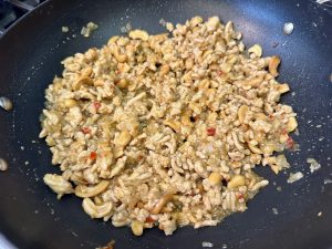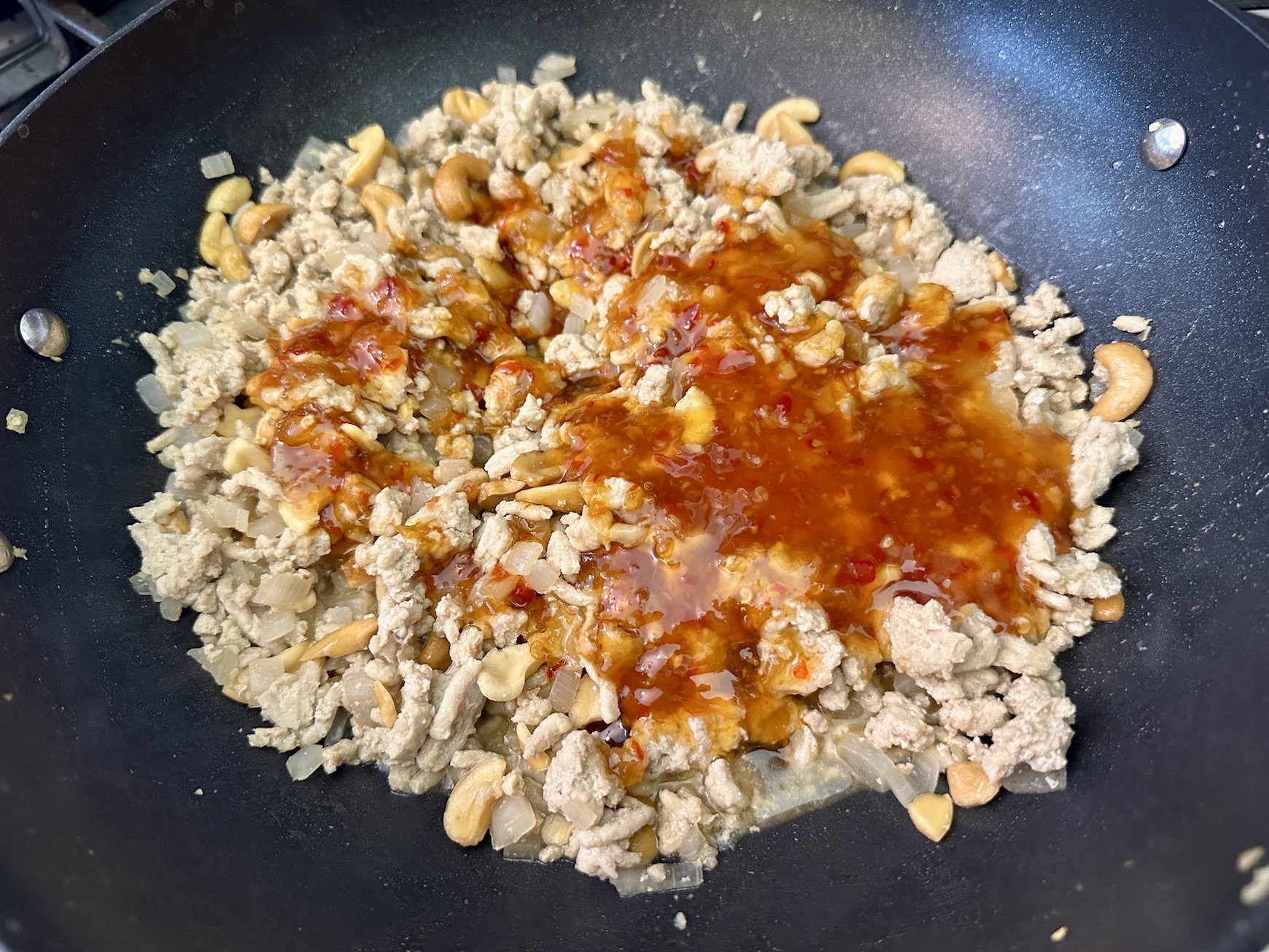 Add the soy sauce and lime juice and stir to combine. Then, add the entire jar of Thai Sweet Chili sauce and the cashews and stir to combine. Reduce the heat to low and simmer for about 5 minutes, remove from the heat.