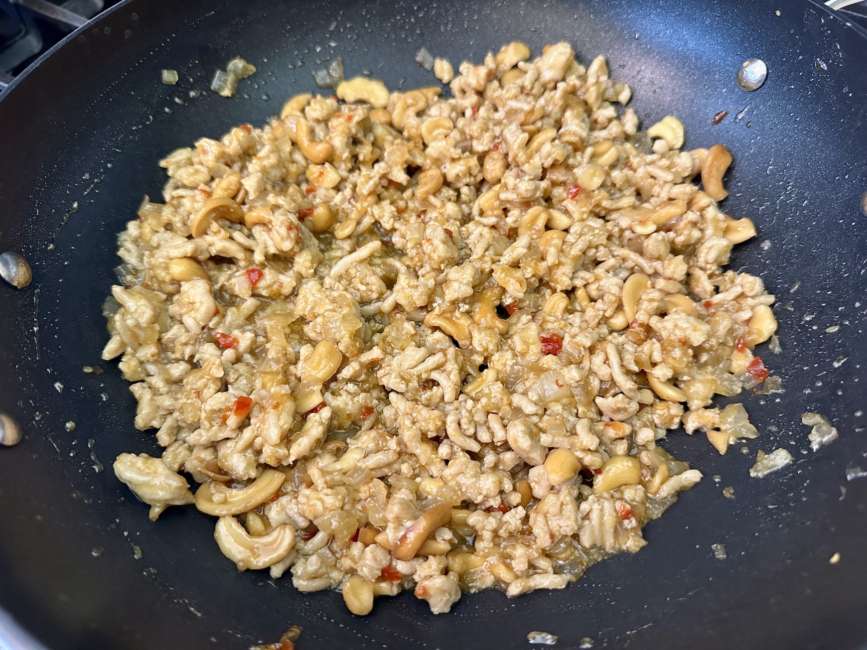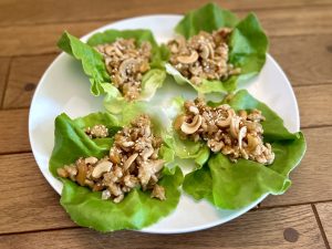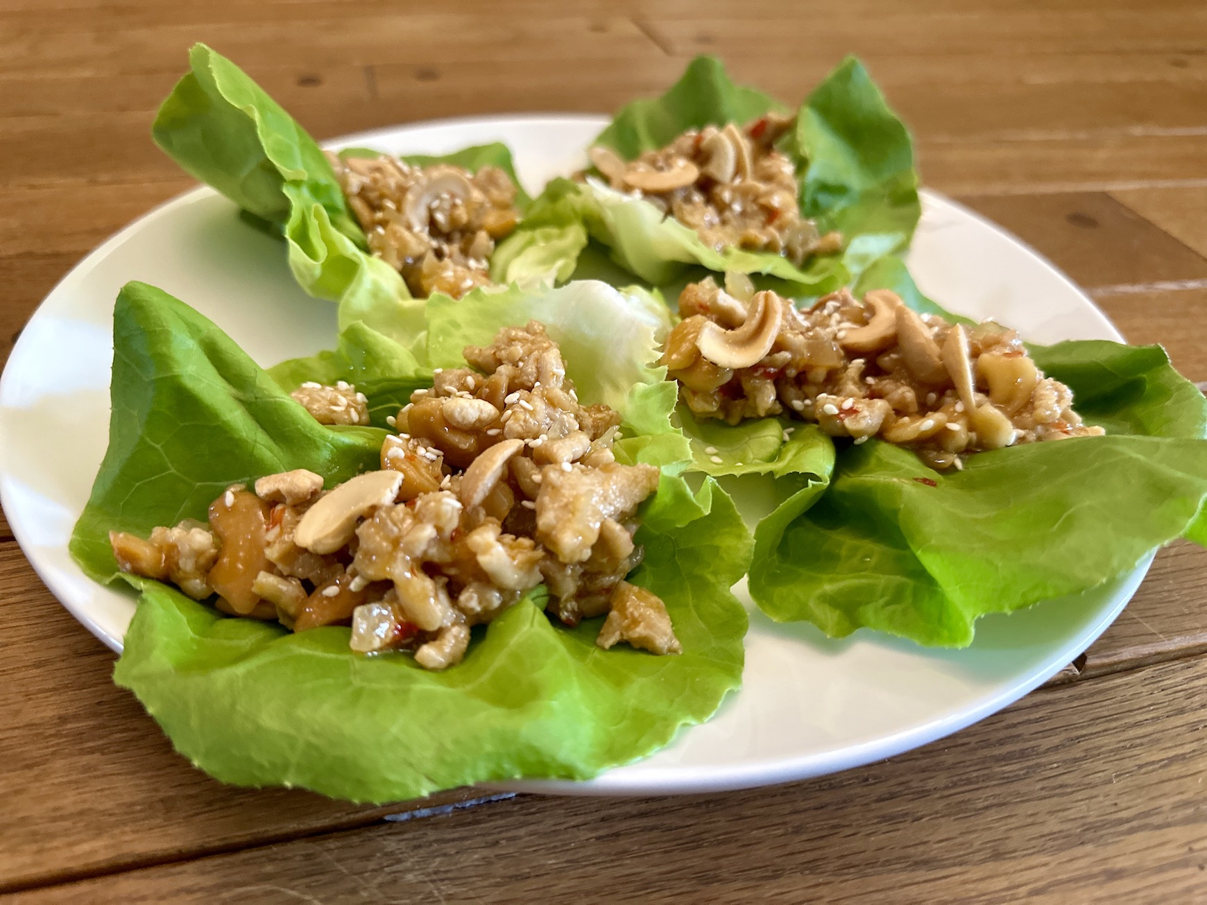 You are ready to assemble the lettuce wraps! Lay out the lettuce on plates, add a heaping scoop of the chicken mixture to each. Then, garnish with cashews and a sprinkle of sesame seeds.