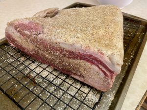 You want to start by mixing the spices together and rub all over the brisket to completely coat it. I like to put the brisket on a wire rack that’s sitting on a baking sheet. The baking sheet will catch any of the spice mixture that falls off and ultimately make it easier to transport the brisket.