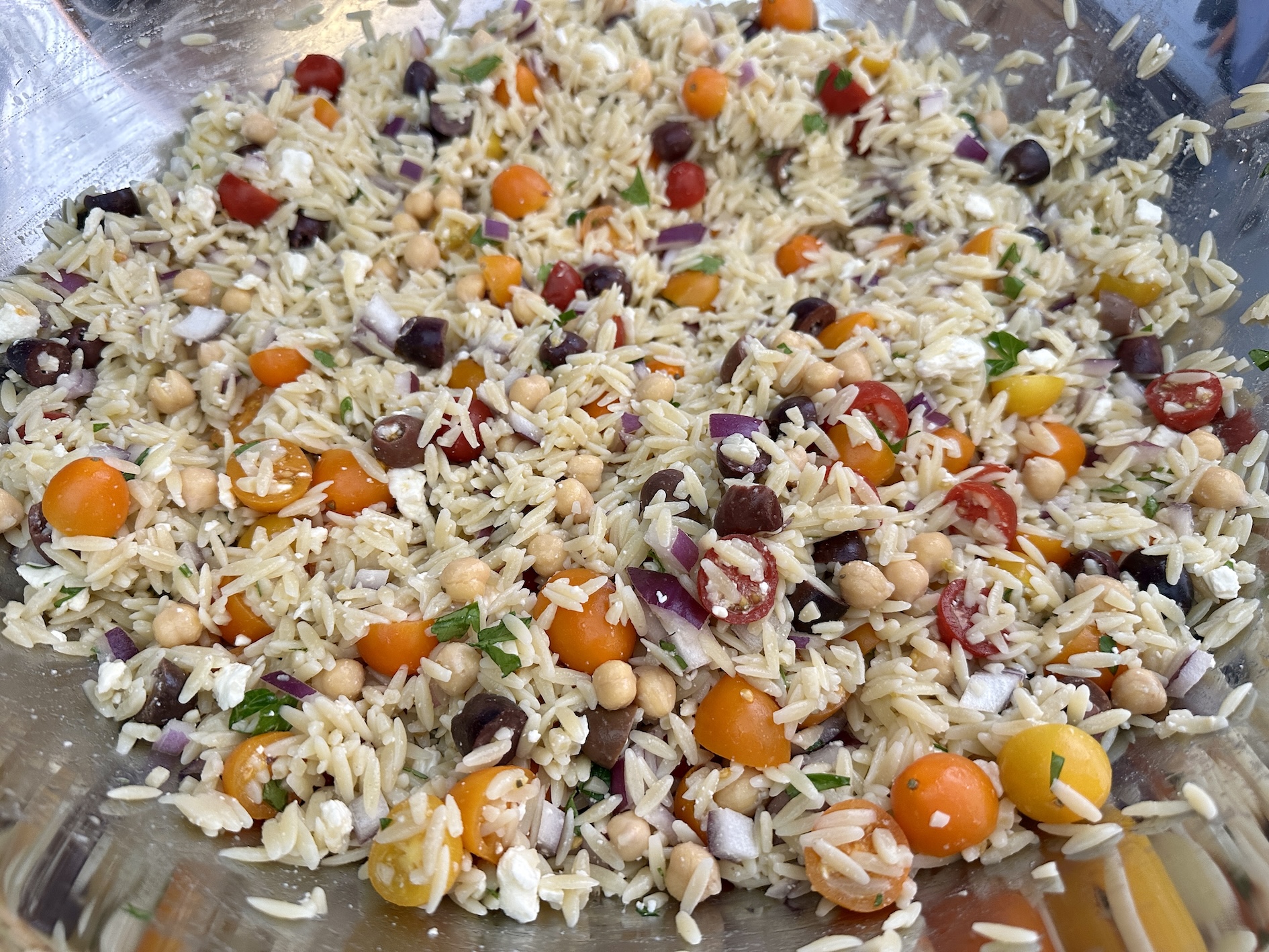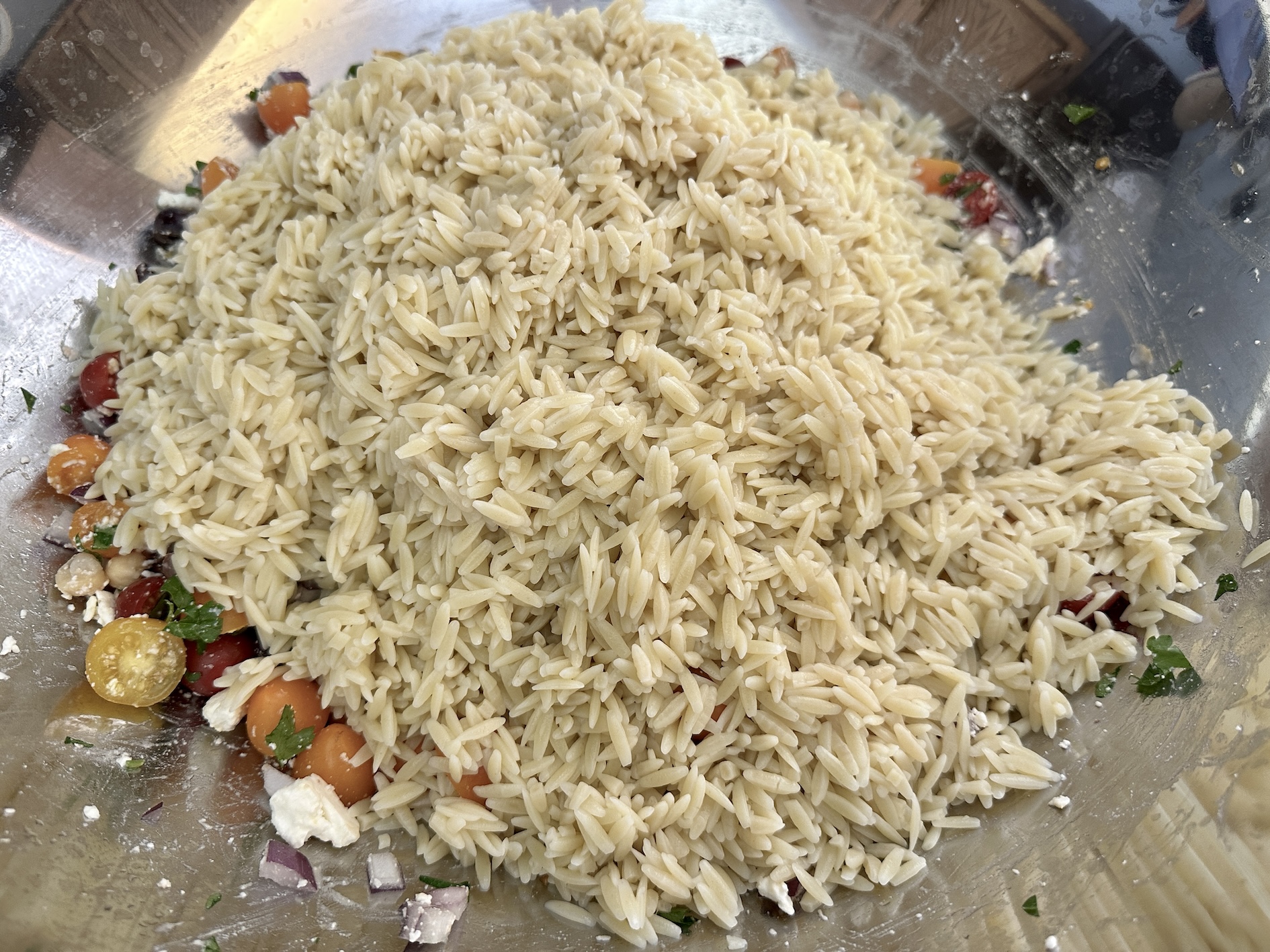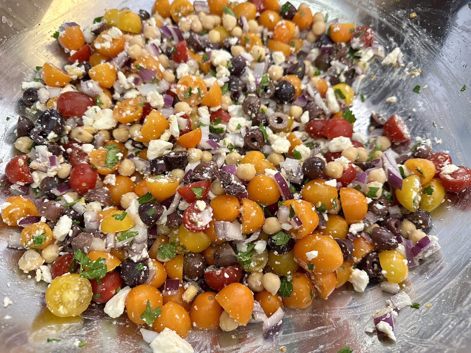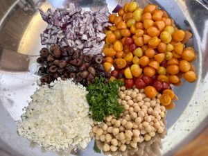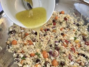Now you want to prepare the veggies – slice the tomatoes and olives in half, drain and rinse the chickpeas, chop the onion and parsley. Add all to a LARGE mixing bowl. Also add the cooked orzo and crumbled feta. Stir until well combined.