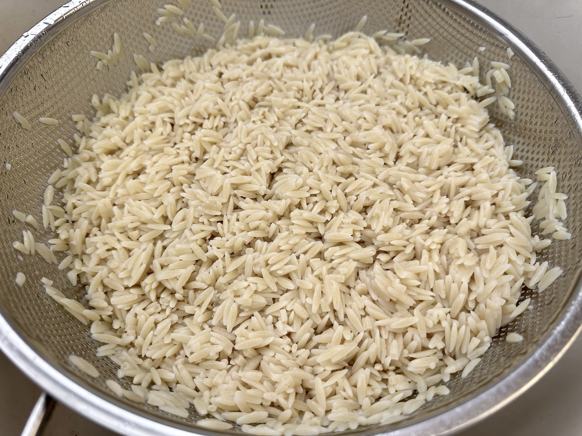 Next, bring a large pot of water to a boil and cook the orzo according to package instructions. Drain, rinse, and cool completely.