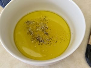 Start by mixing the olive oil, lemon juice, and garlic in a small bowl. Season with salt and pepper and set aside.