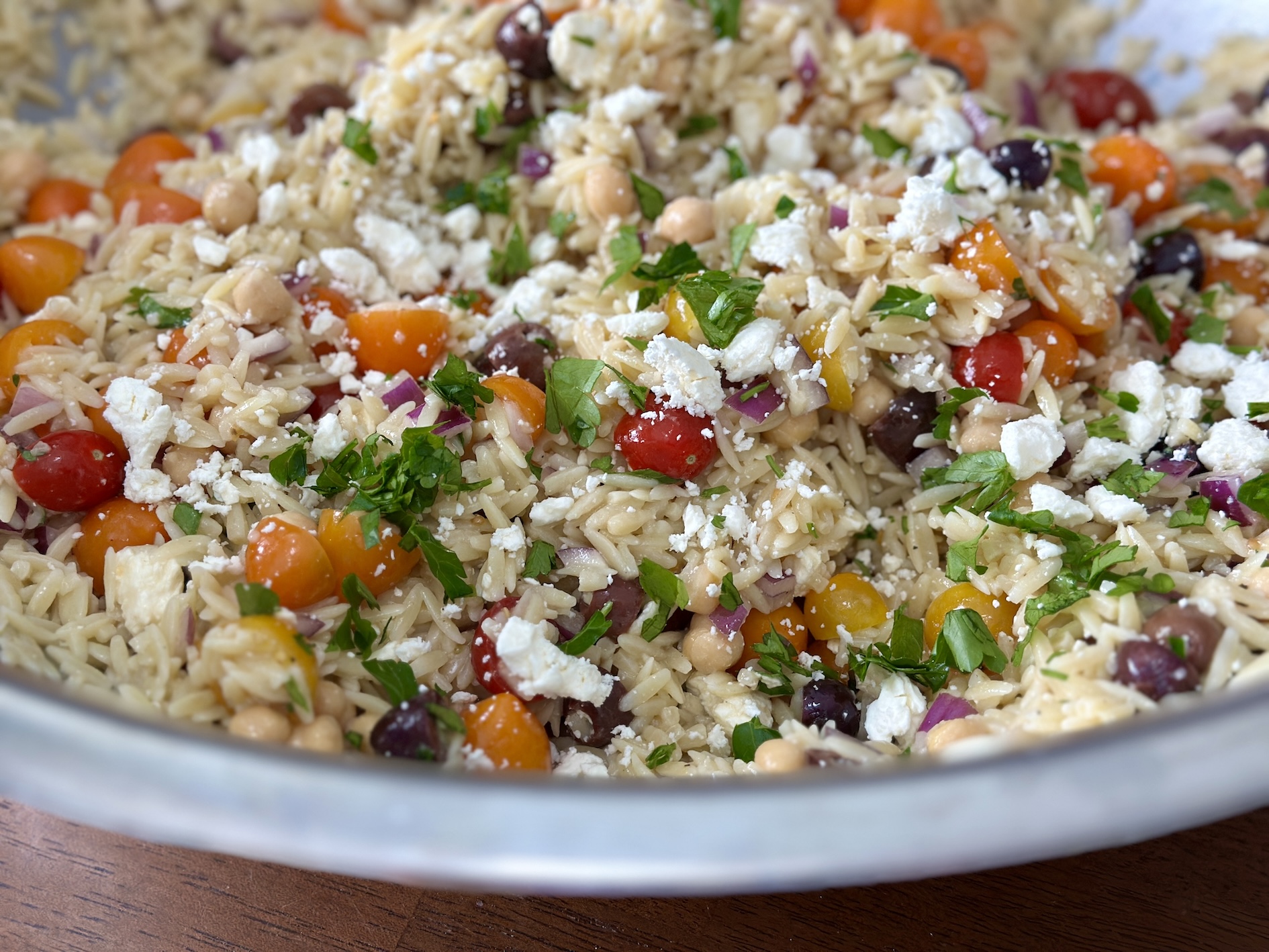 In conclusion, this Mediterranean Orzo Pasta Salad is not only delicious but also incredibly versatile. Its combination of fresh vegetables, creamy feta, and hearty chickpeas makes it a filling yet refreshing dish that can be enjoyed on its own or as a side to complement any main course. With the tangy lemon-garlic dressing tying everything together, it’s a perfect dish for any occasion. Whip it up for a quick lunch, a weekend barbecue, or a crowd-pleasing side at your next gathering – you’ll be sure to savor every bite.