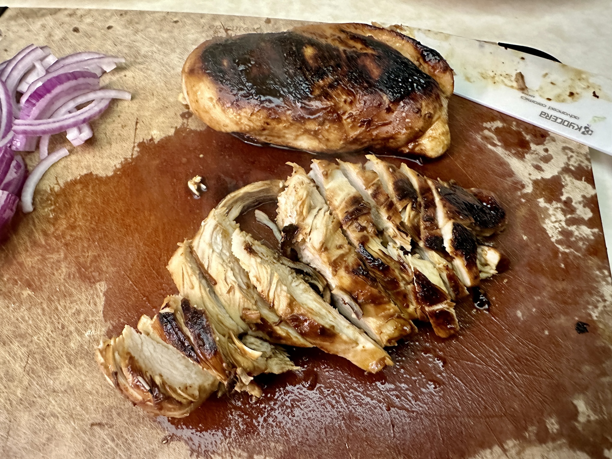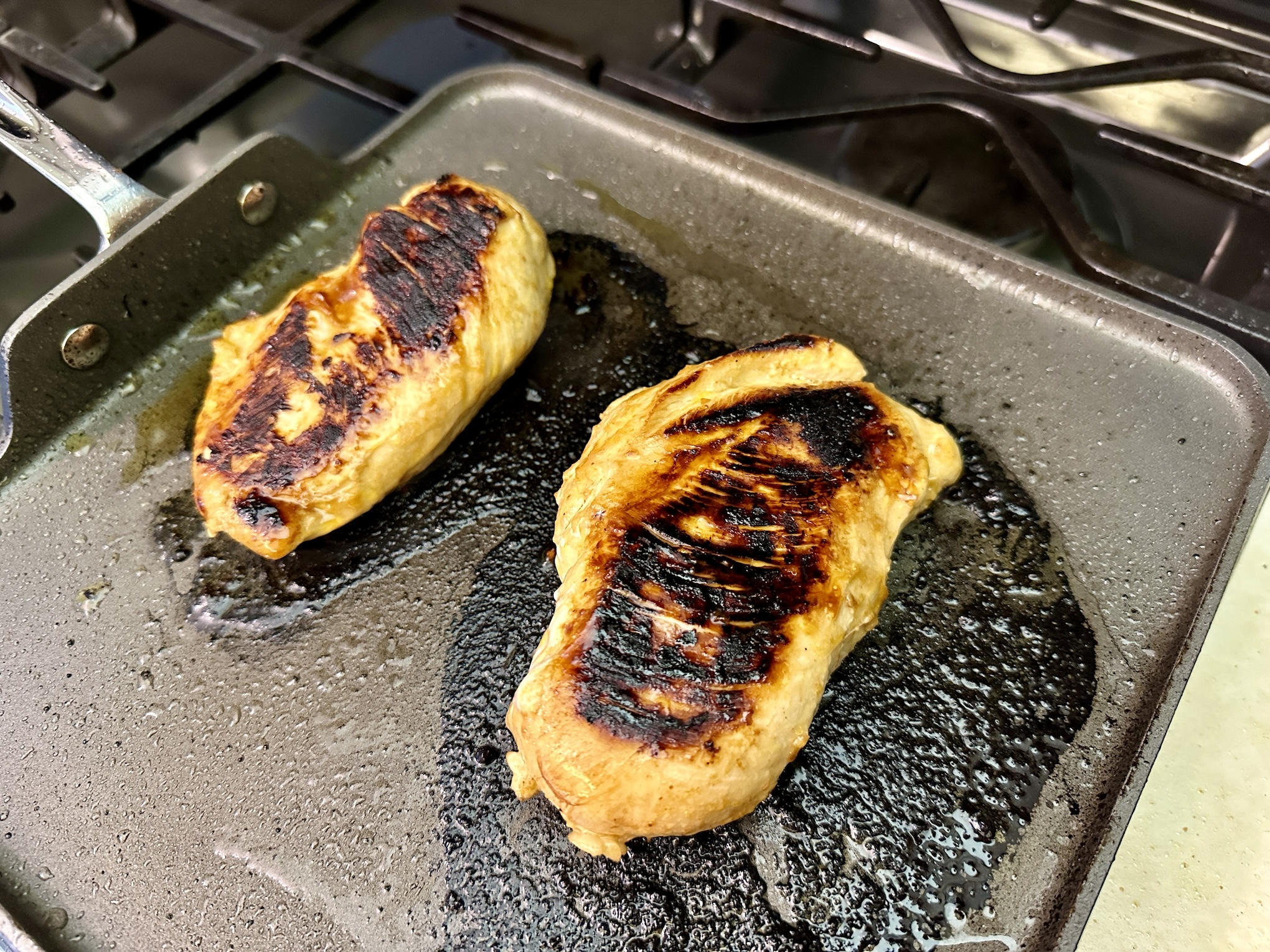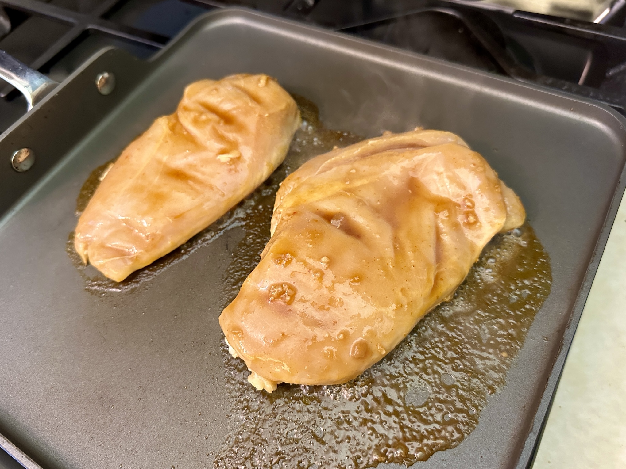 Next, heat oil in a large skillet over medium heat. Add the chicken and discard the marinade. Cook on each side for about 7-8 minutes or until cooked through and an internal temperature of 165 degrees F is reached. Once done cooking, remove to a cutting board and let sit for a few minutes then slice into thin strips.
