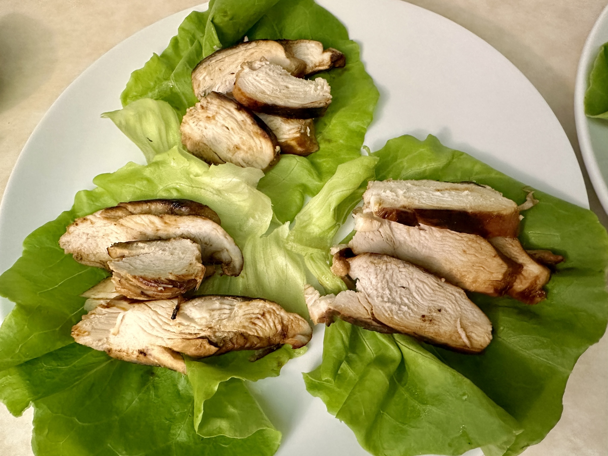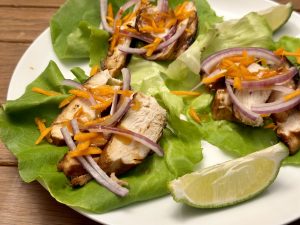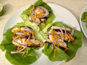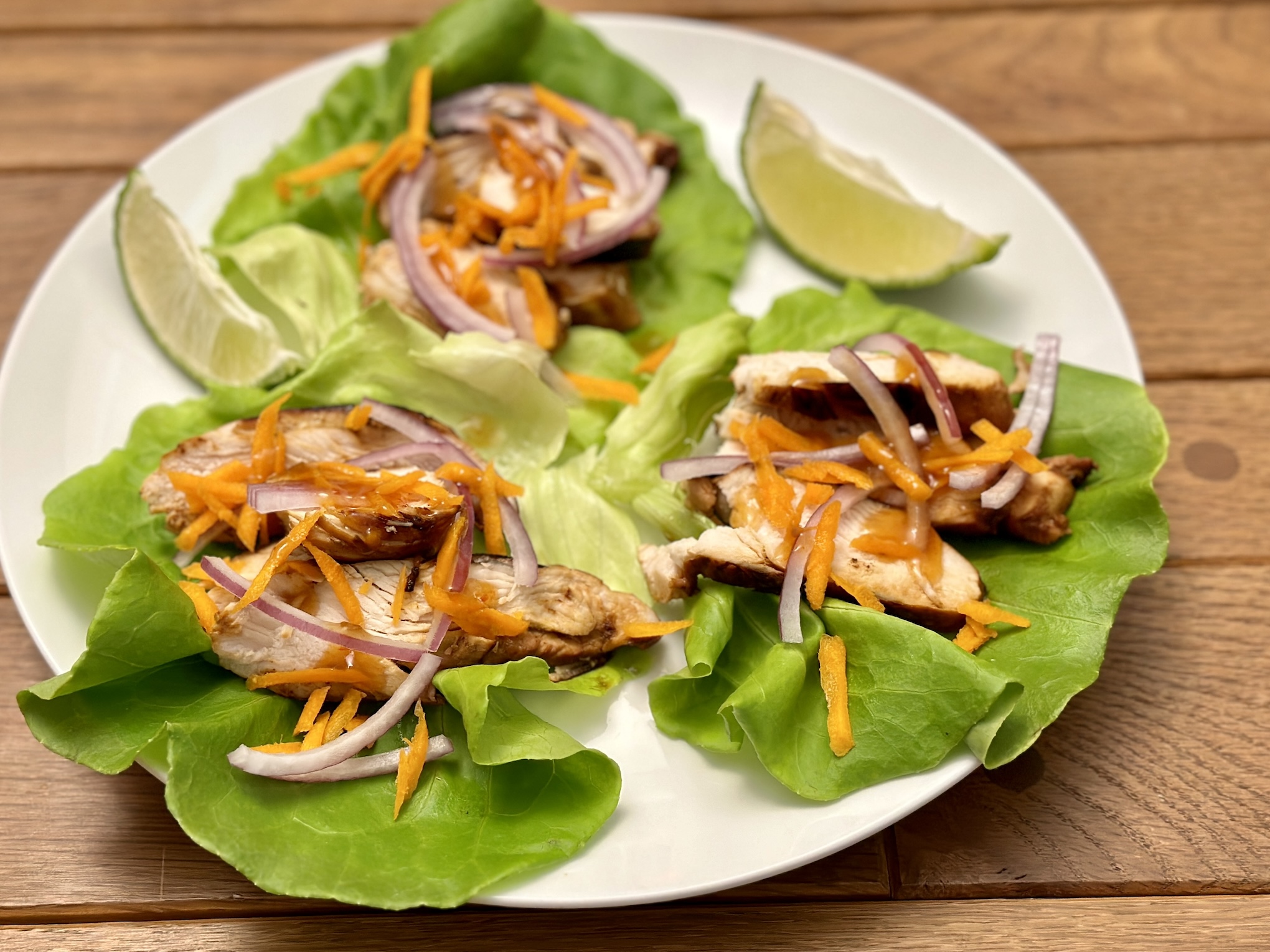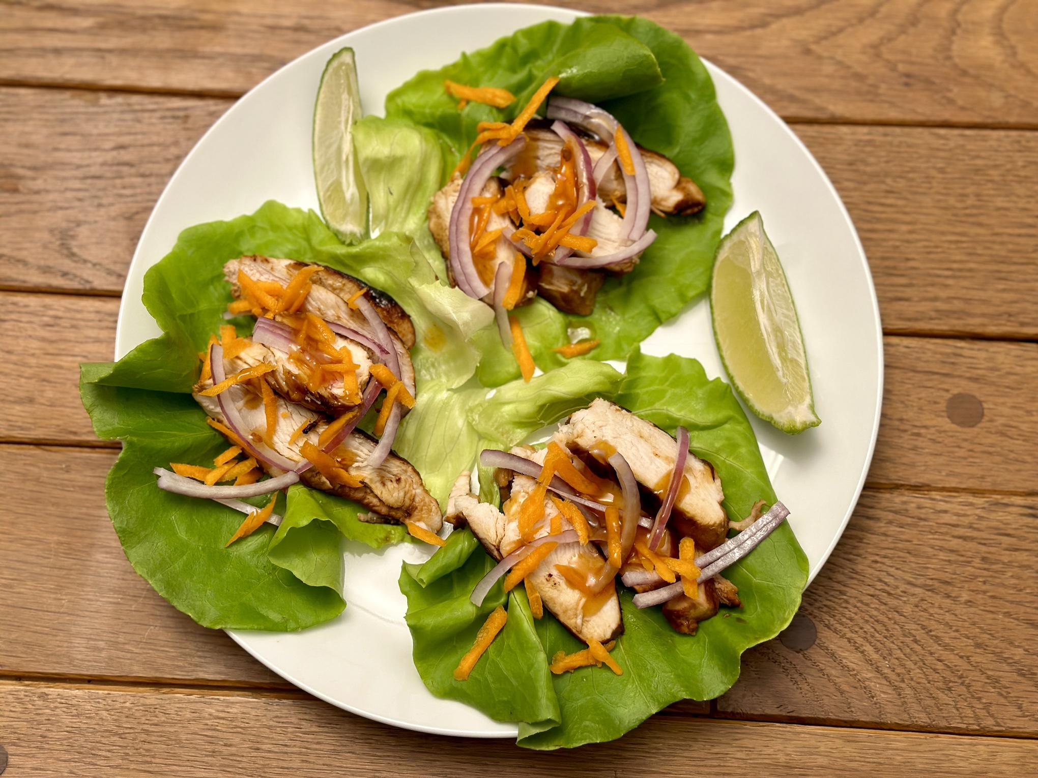 You are now ready to assemble the lettuce wraps! Lay out the lettuce cups and add sliced chicken to the bottom of each. Garnish with sliced onion and shredded carrots. Add a drizzle of the sweet chili sauce and garnish with a lime wedge on the side to squeeze over the top.