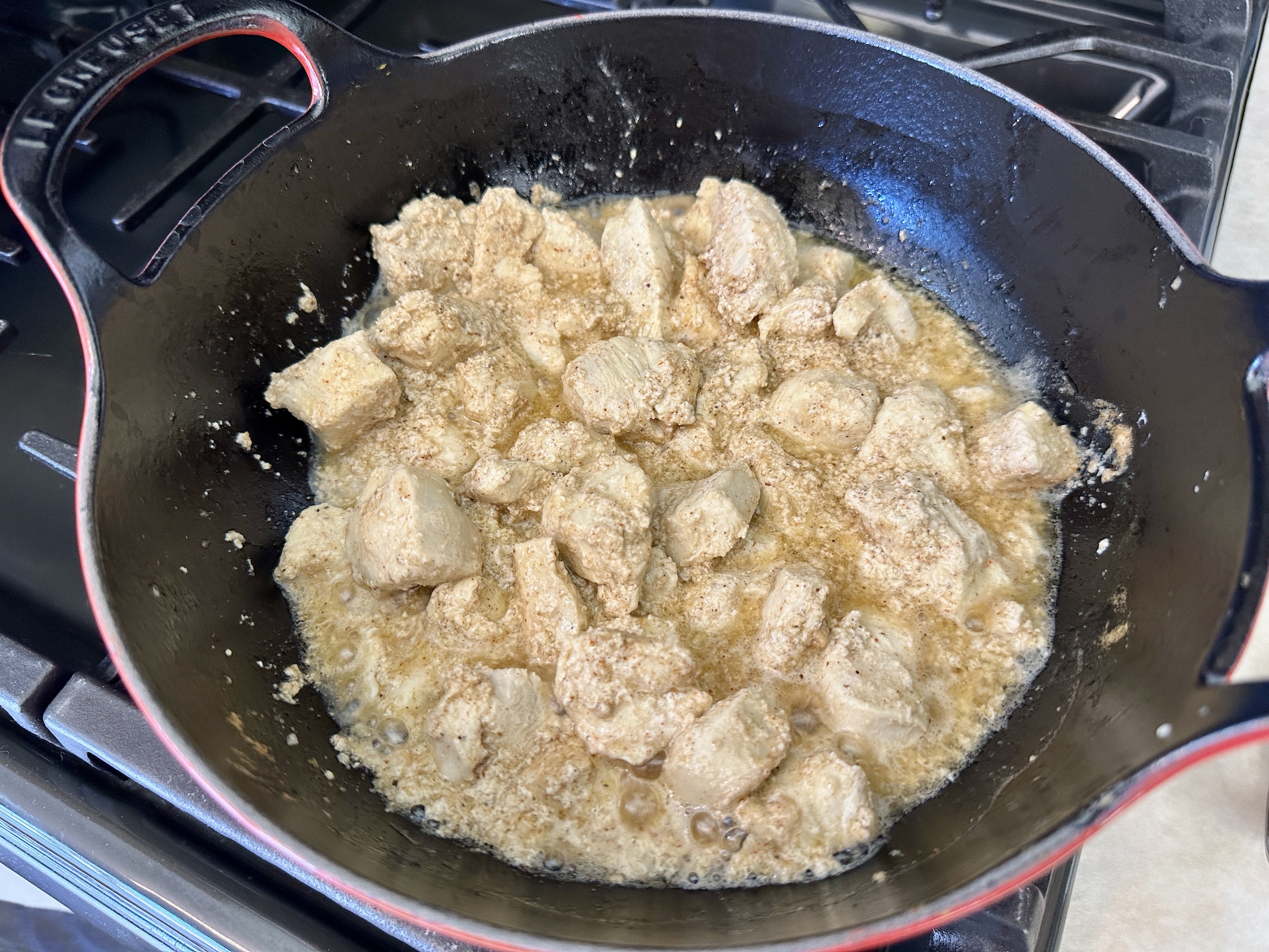 Heat oil in a large skillet or (preferably) Balti dish over medium-high heat. Add the chicken and sauté until browned, about 5 minutes. You might need to cook in batches if your pan isn’t large enough to hold all the chicken without overcrowding the pan. The chicken will not be completely cooked through at this point. It will finish cooking in a later step.