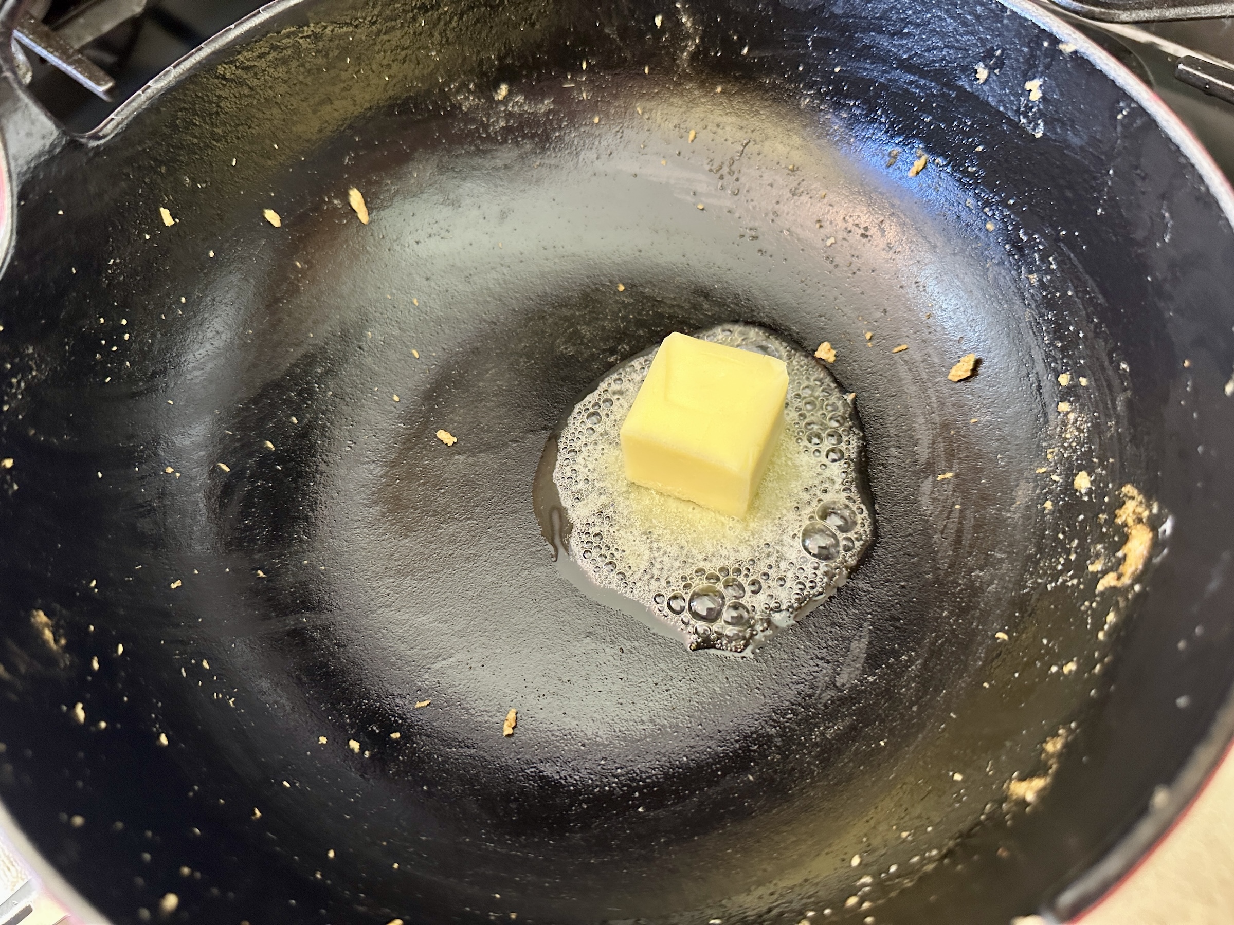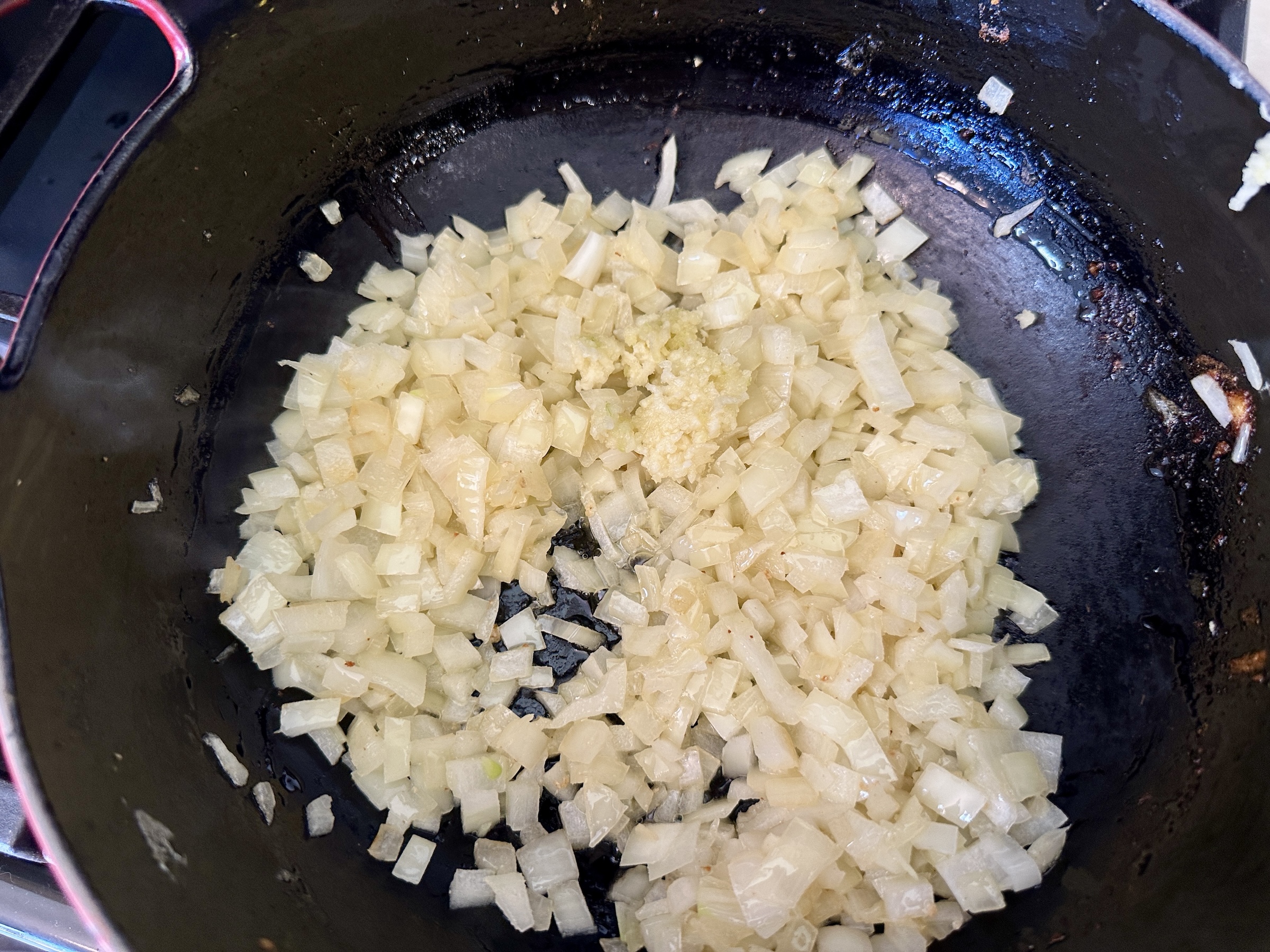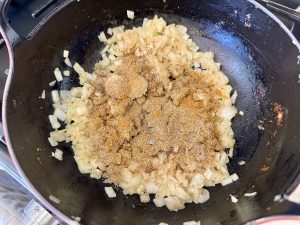Using the same pan (no need to wipe clean), melt the butter. Once melted, add the onion and sauté until soft and translucent, about 3 minutes. Add the garlic and ginger, stir to combine, and continue to cook for another 30 seconds.