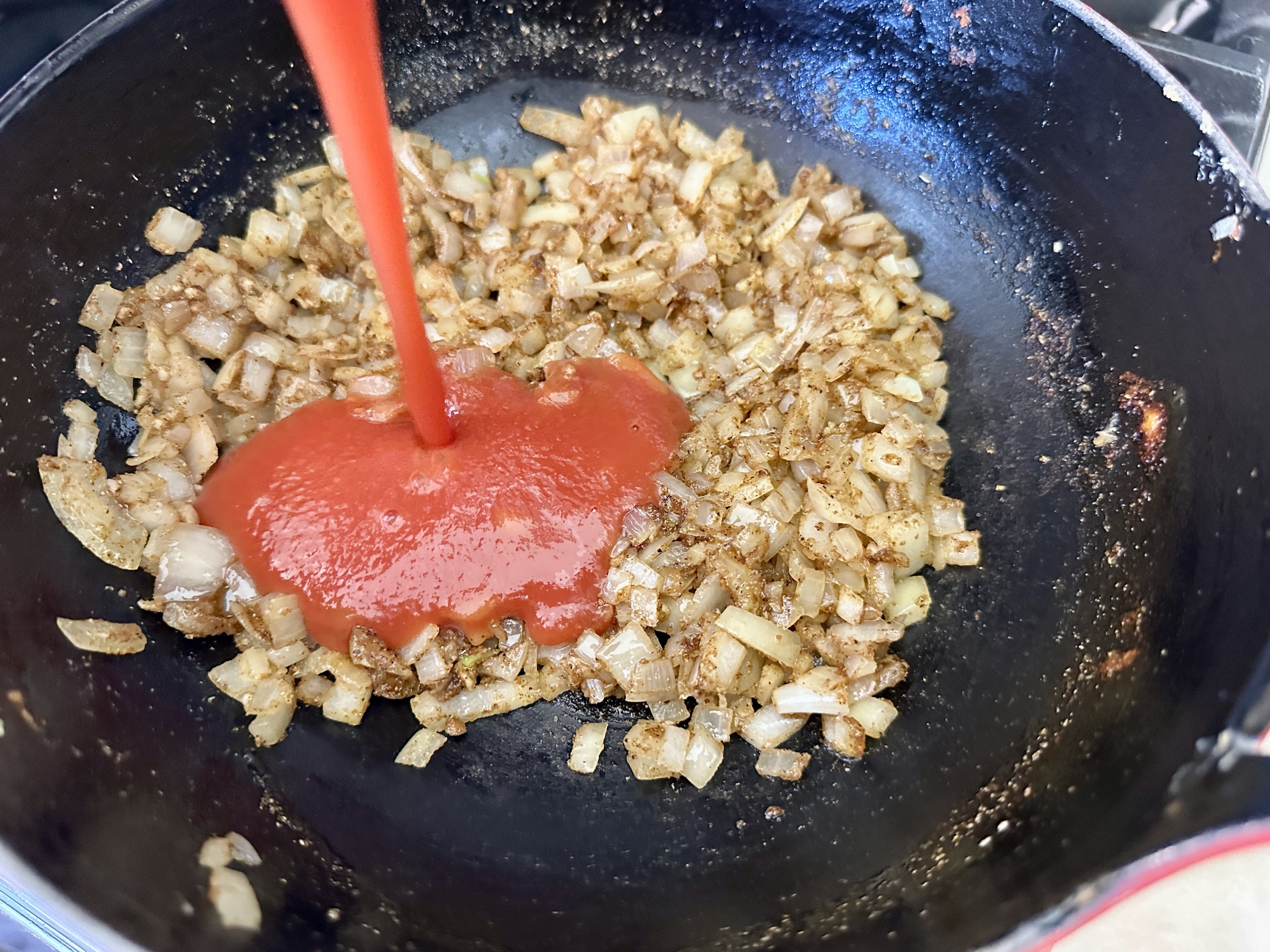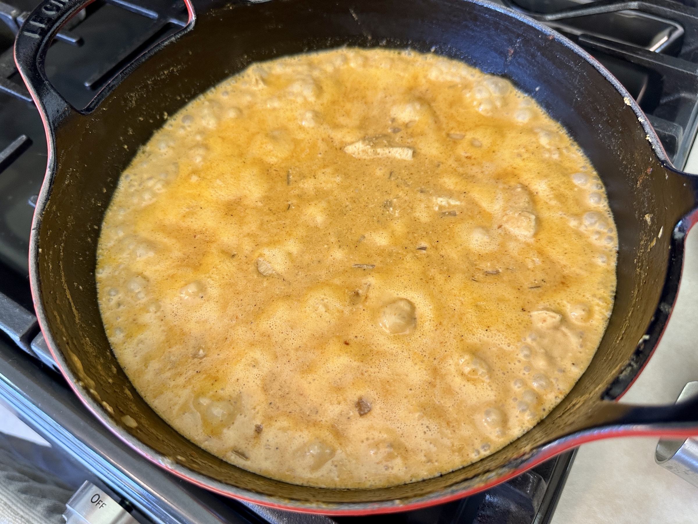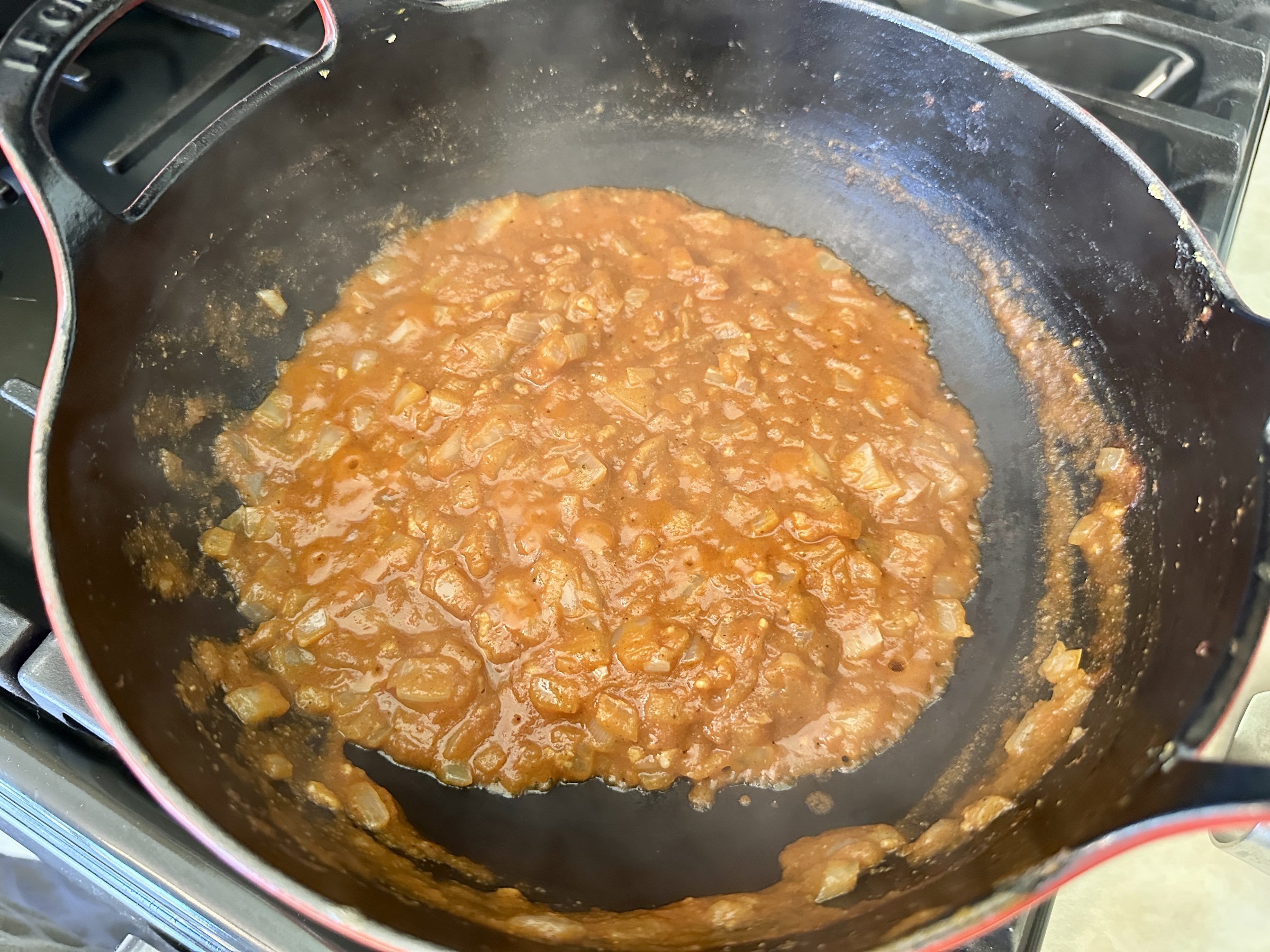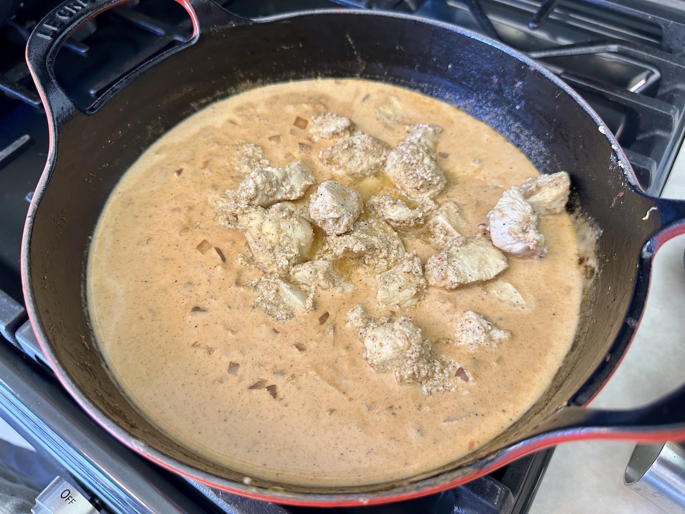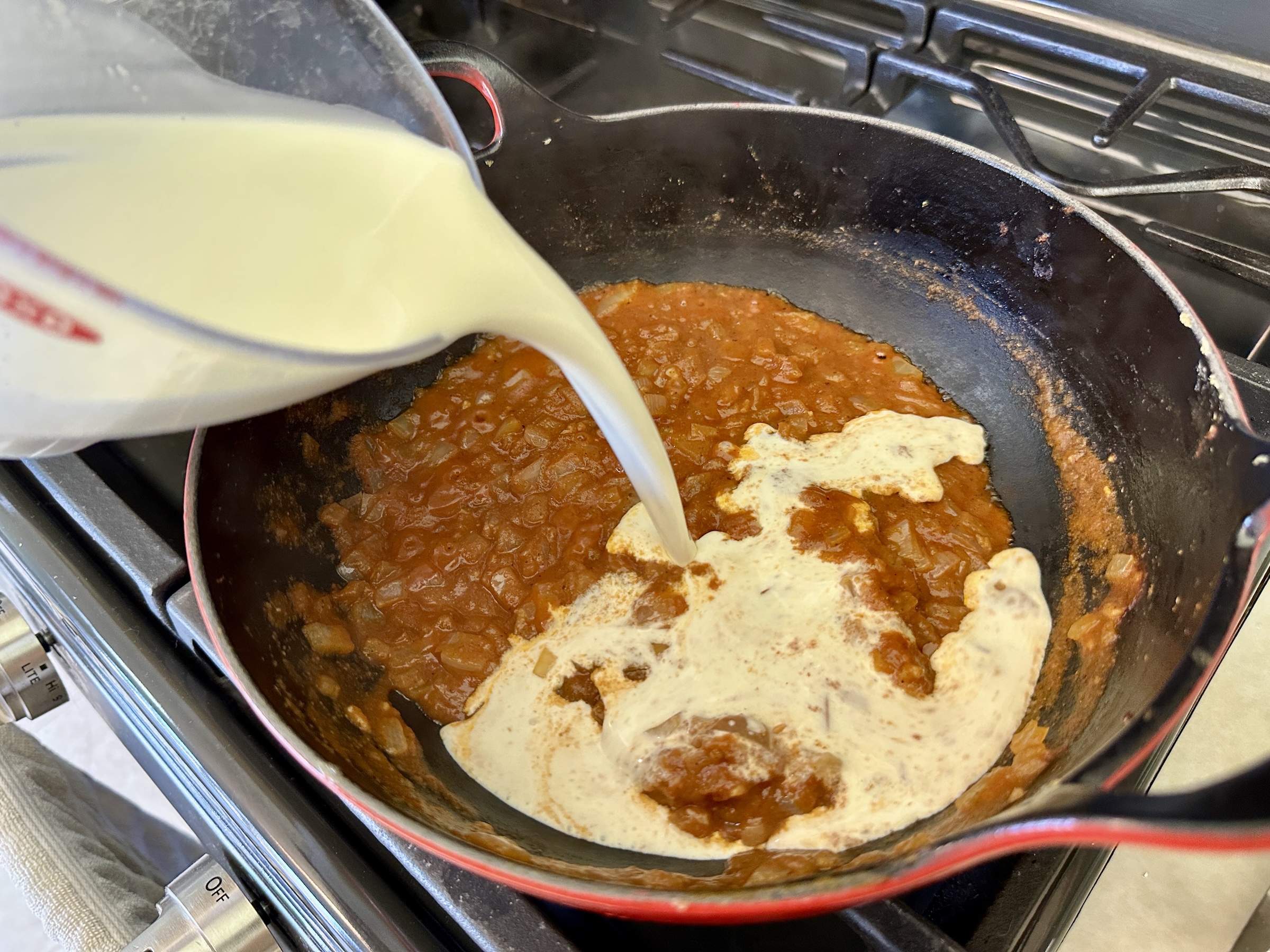 Add the brown sugar, coriander, cumin, paprika, and garam masala. Stir to combine and continue to cook for about 30 seconds. 2. Add the tomato sauce, stir to combine, and bring to a simmer. Let simmer for about 3-5 minutes, stirring occasionally. Add the heavy cream and stir until incorporated.
