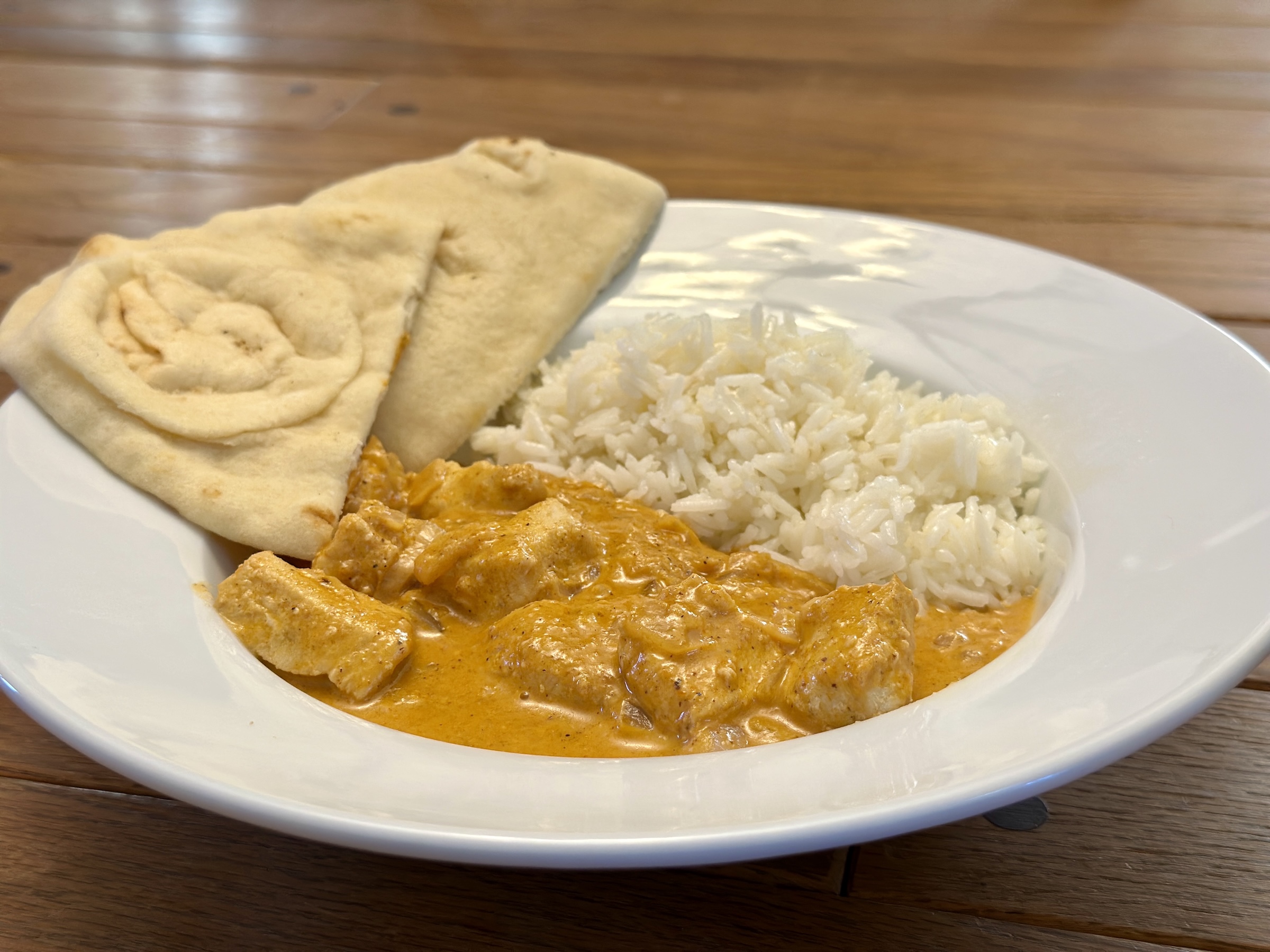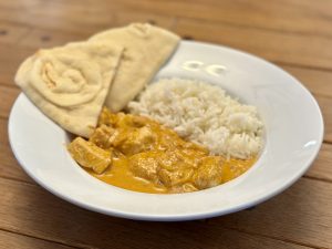 When ready to serve, divide the rice between bowls and top with the chicken mixture and some sauce. Garnish with cilantro. Serve with warmed naan bread on the side for dipping. Enjoy!