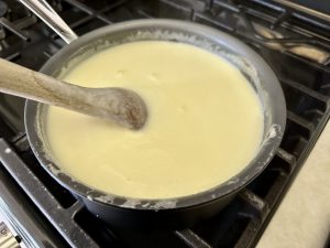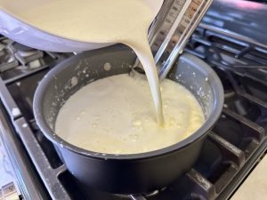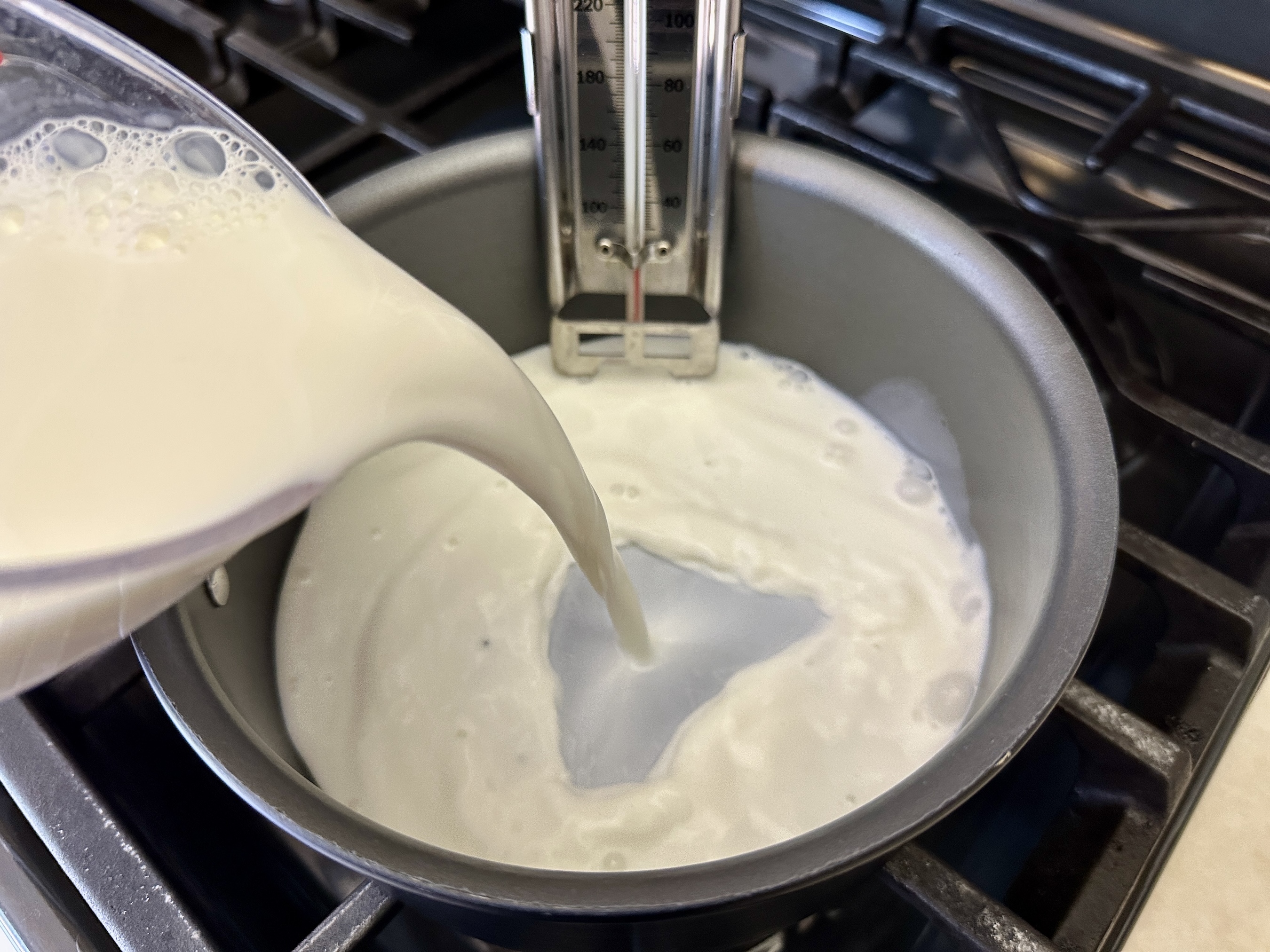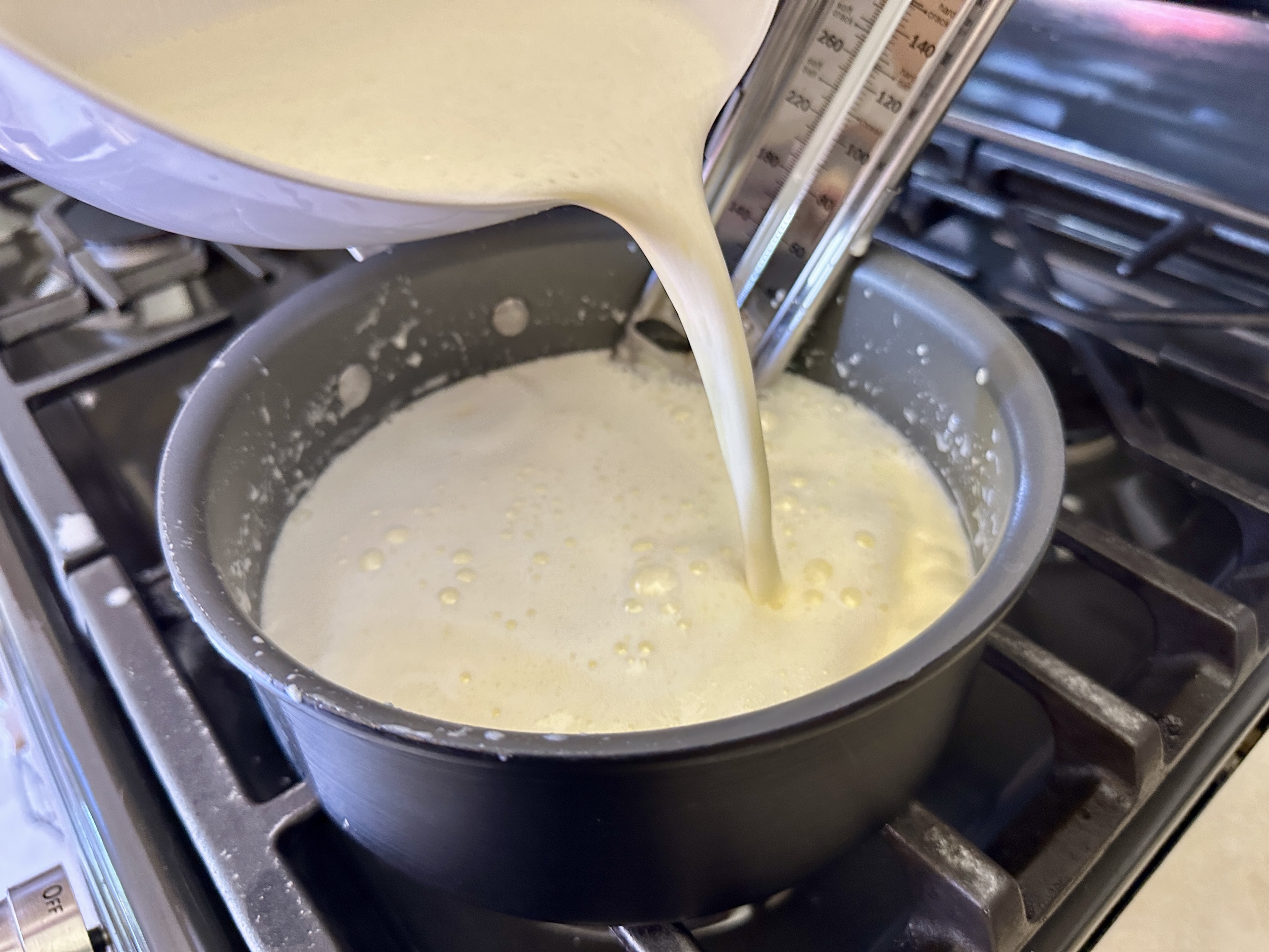 Add the milk and heavy cream to a medium saucepan. Heat on medium-low and stir frequently until the temperature reaches 170 degrees F (recommend using a candy thermometer) and bubbles start to form around the edges of the pan, but do not boil.