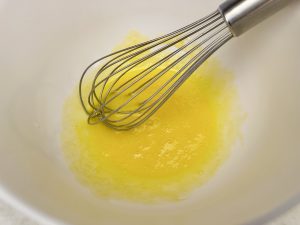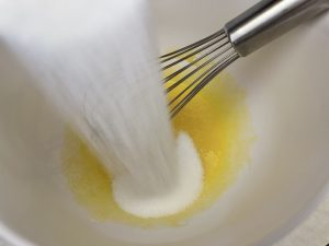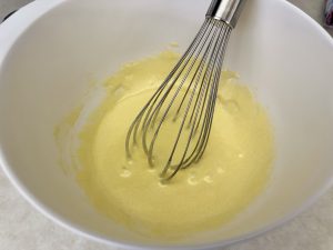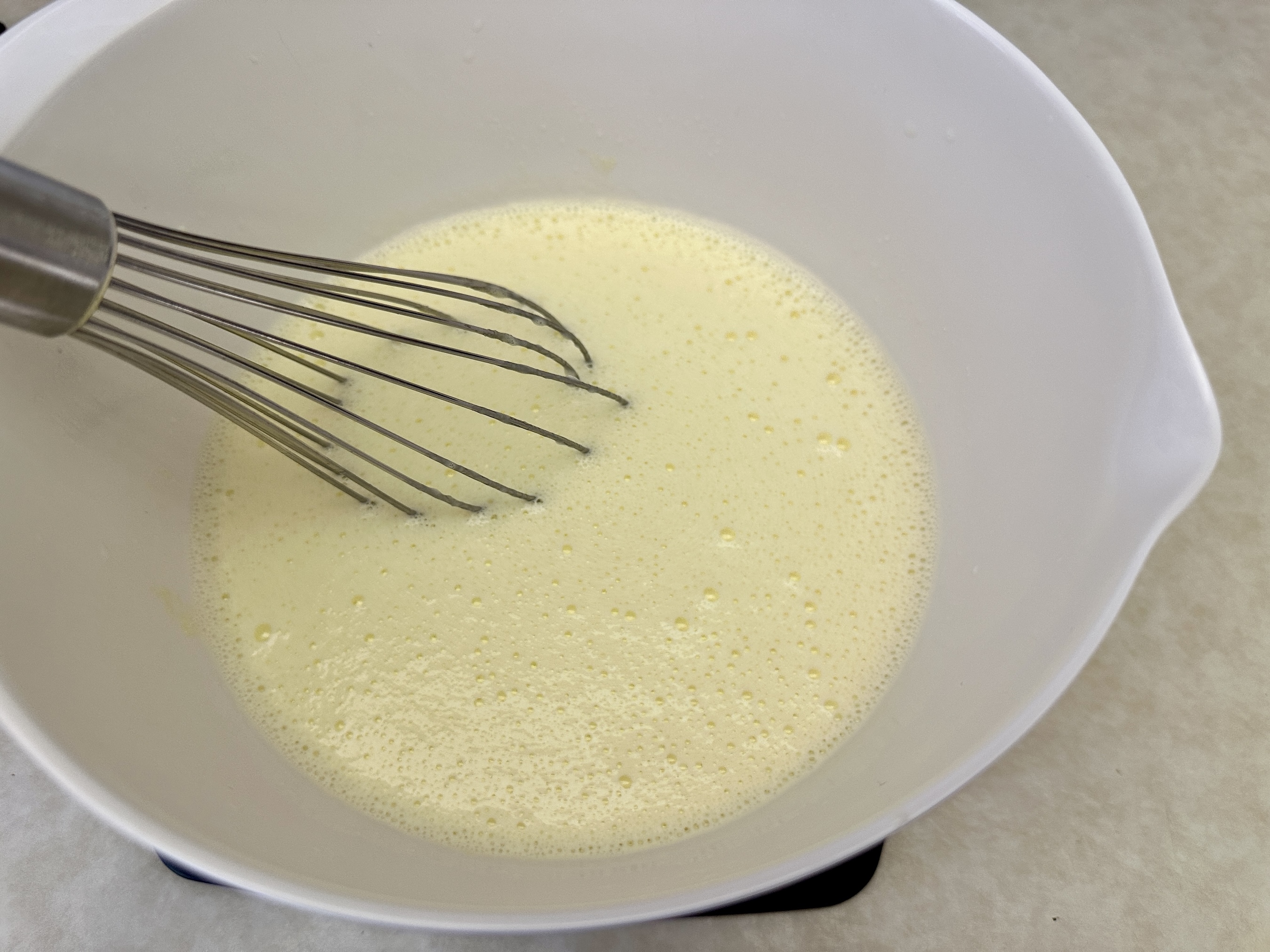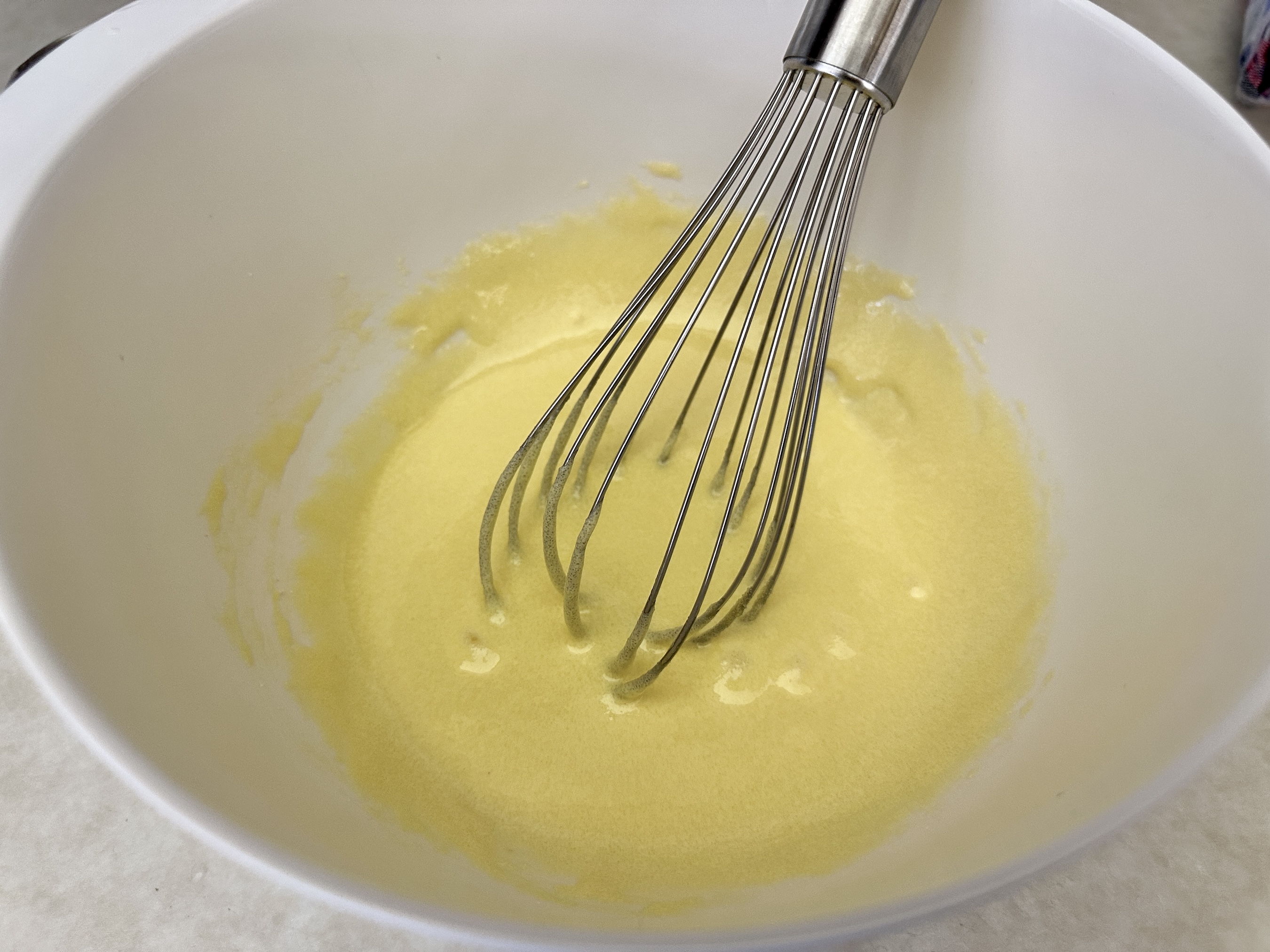 In a separate bowl, whisk the egg yolks, then gradually whisk in the sugar until the mixture is smooth. Temper the eggs by adding a drizzle of the hot milk to the bowl while whisking. Continue to whisk and add more hot milk until all ingredients are combined. You must keep whisking or the eggs will start to cook.