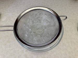 First, you want to prepare the ice cream. Add ice to a large glass bowl and place a smaller bowl inside / on top of the ice. Place a fine mesh strainer over the bowl. Set aside.