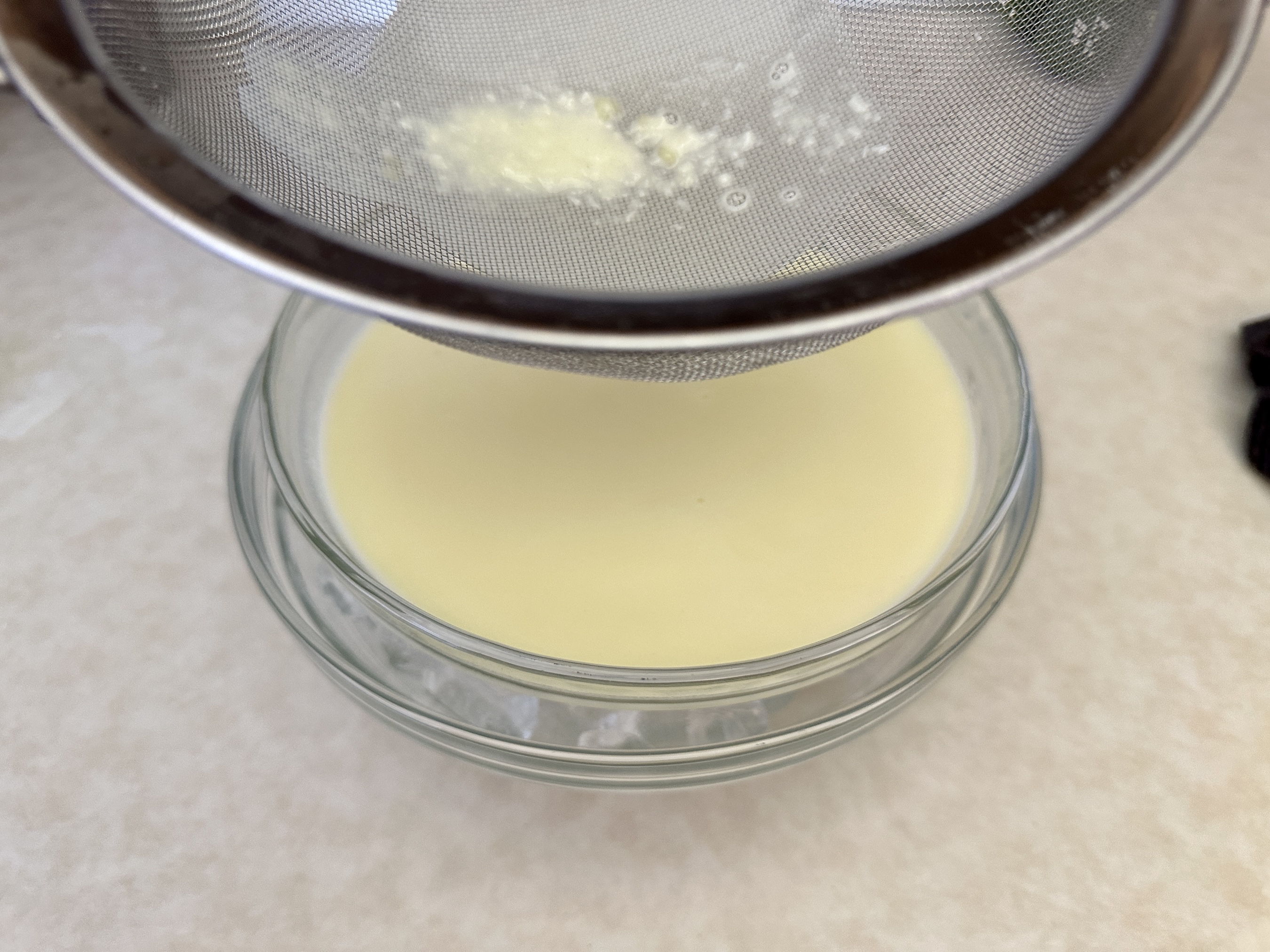 Pour the mixture through the strainer and into the smaller bowl that’s sitting in ice. Cool the ice cream for 30 minutes, stirring occasionally. Then, cover and refrigerate for at least 4 hours or up to overnight.