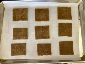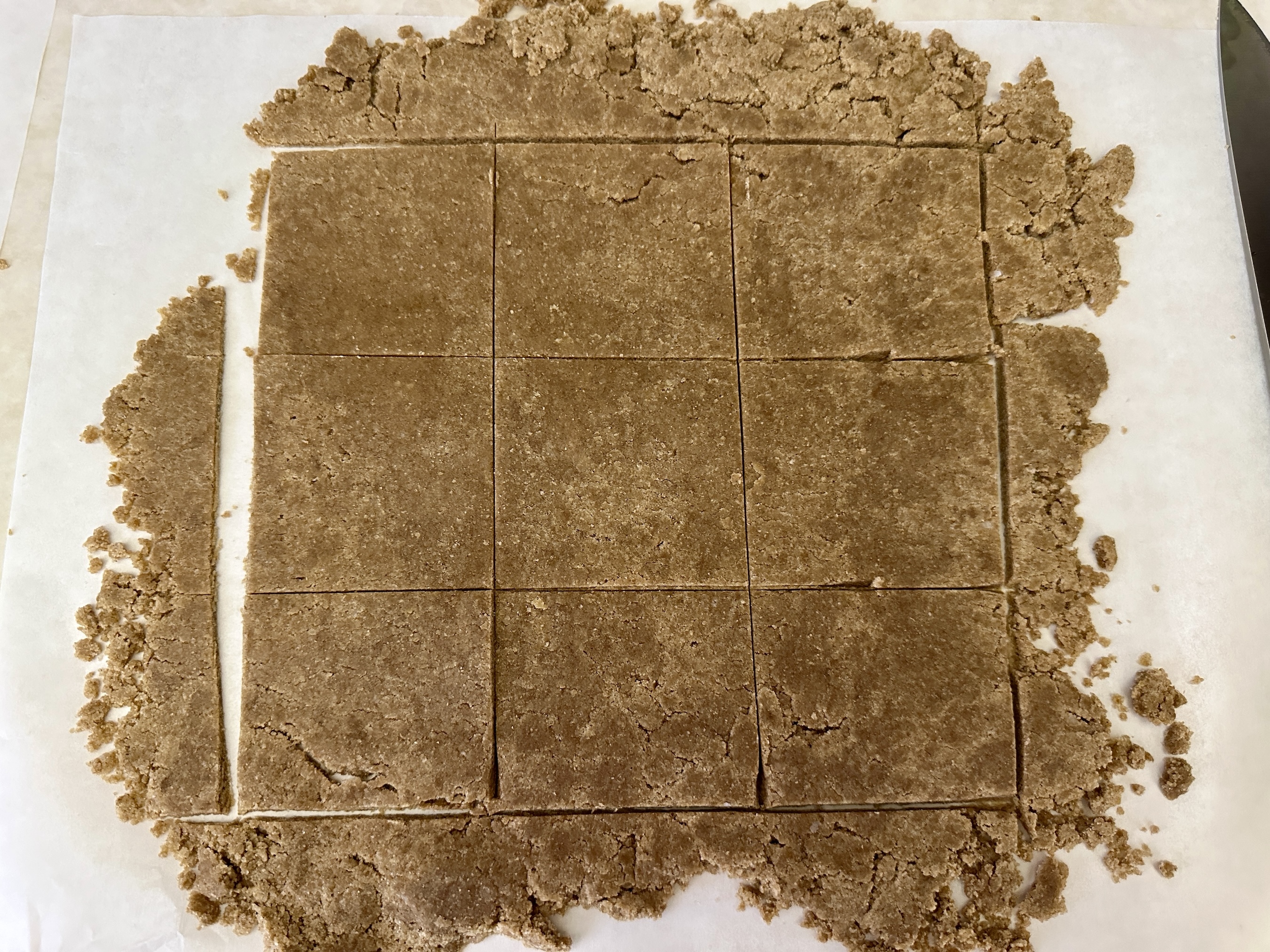 Preheat the oven to 350 degrees F and line 2 baking sheets with parchment paper. Remove ½ of the dough and place on a piece of parchment paper or lightly floured counter. Roll to about 1/8-1/4-inch thick. Slice into crackers and place on the baking sheet. Make the crackers as large or small as you want for your ice cream sandwiches. Use a fork to poke a few holes in each cracker. Repeat with the other half of the dough.