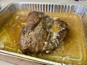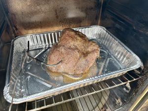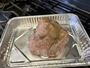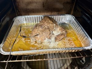 Start by rubbing oil over the turkey breast then sprinkle with salt and pepper on all sides. Place in a 9×13 foil pan and refrigerate for at least 2 hours or up to overnight.