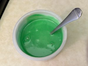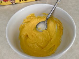 While the brownies cool, prepare the witch hats. Turn the cookies over so the stripes are facing down. Remove about ¼ cup of the vanilla frosting and place in a bowl. Add orange food coloring, or any color you choose, and stir to combine. Then, transfer the frosting to a piping bag. I like to use gel food coloring, but liquid will also work.