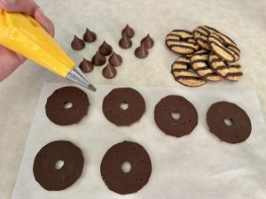 Unwrap the Hershey Kisses and place on top of each cookie. Make sure the holes are completely covered. Pipe orange frosting around each Hershey Kiss, along the bottom, so they stick to the cookies. You want to let the frosting harden slightly.