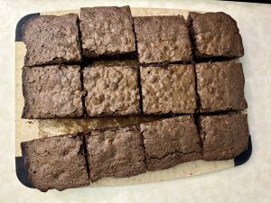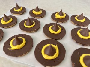 Slice the brownies into 12 bars. You can make smaller bars if you prefer and make additional witch hats. The brownies are quite large, but they hold the witch hats nicely and can be shared if considered too big.