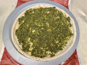 Bake the dough (as is, with no toppings) for ½ the amount of time listed on the package then remove it from the oven and spread the pesto evenly over the top. You can use homemade or store bought pesto. I like to use a homemade pistachio pesto that I tend to have on hand for this recipe, and it works well.