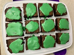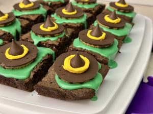 Heat the remaining frosting in the microwave for 30 seconds. Add green food coloring and stir to combine. Spoon this on top of each brownie and let it run down the sides. Top each with a witch hat. Serve and enjoy!
