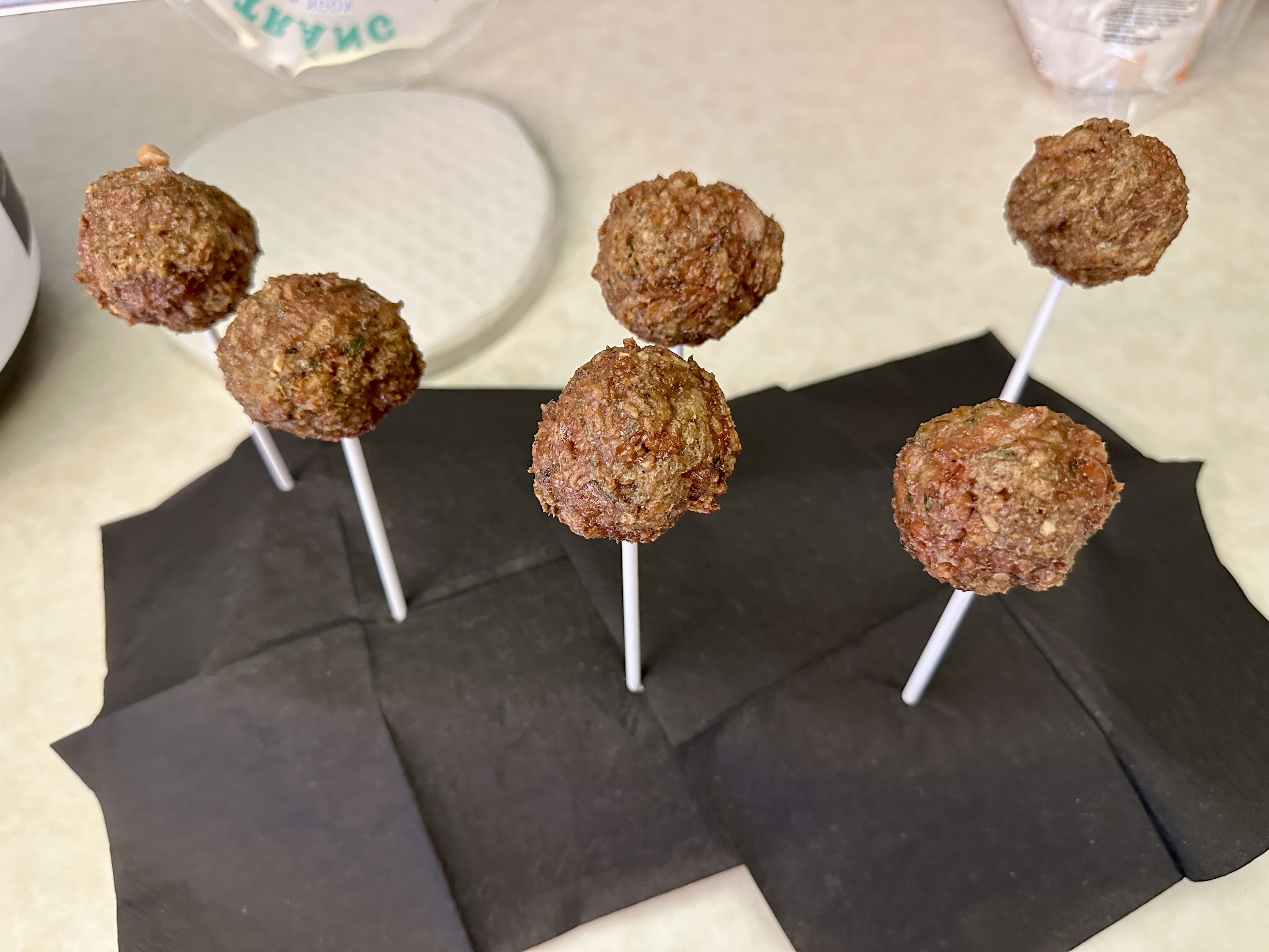 While the meatballs bake, heat the marinara sauce over low heat until hot. When the meatballs are done, skewer each with a treat stick and place in a holder. Styrofoam works well if you don’t have a plastic cake pop base.