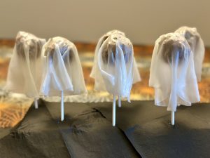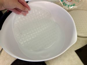 To create the ghost coverings, fill a large bowl with warm water (not hot, just warm). Soak one piece of rice paper at a time for about 10-15 seconds. Place on top of a meatball and help it drape over the sides. The rice paper will become more pliable the longer it’s out of the water. Repeat this step until all meatballs are covered.