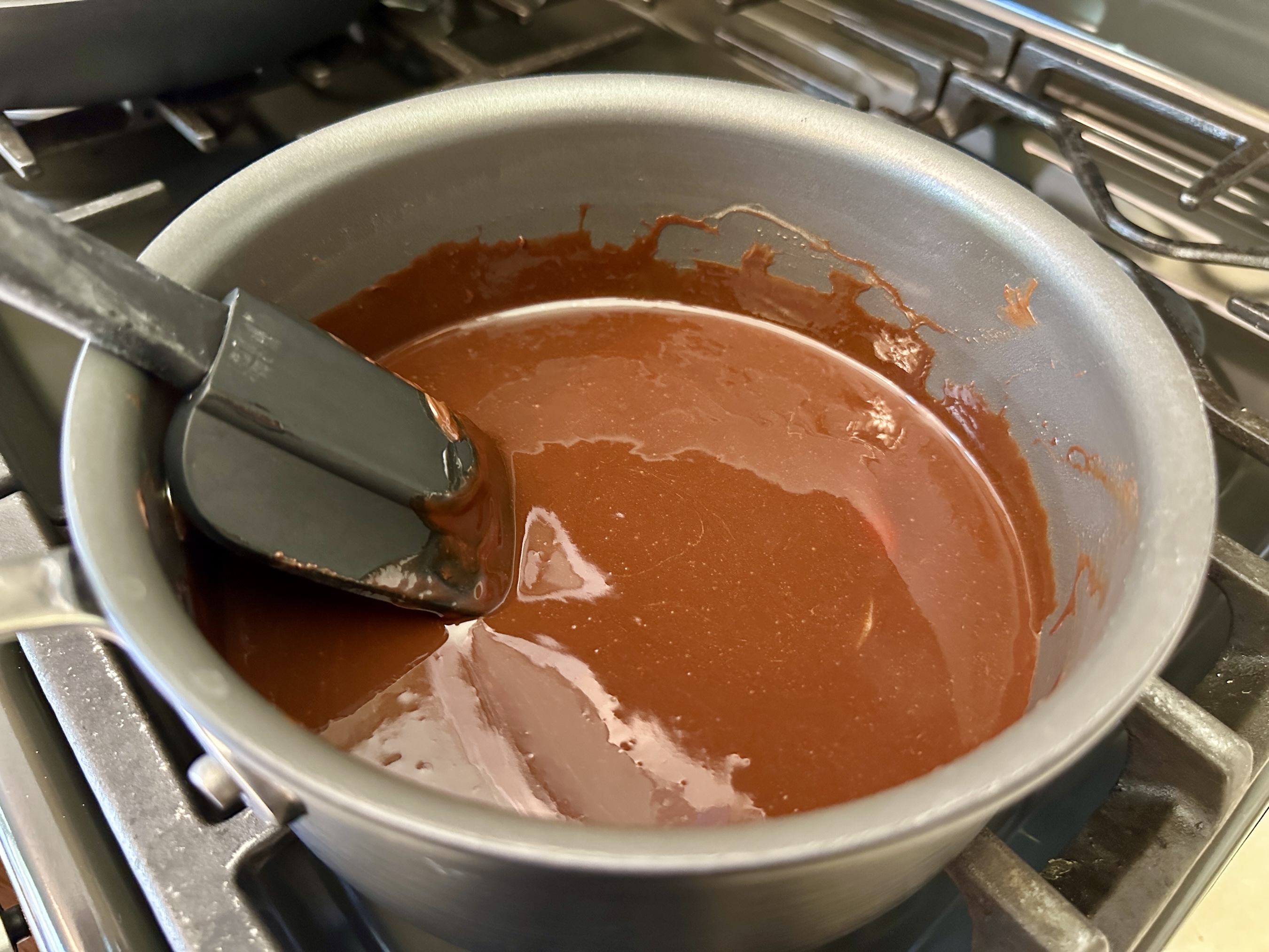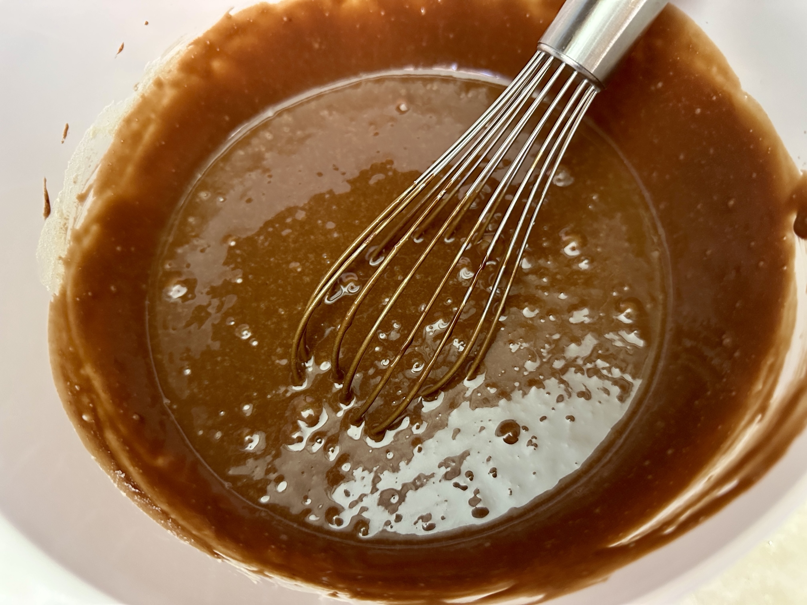 Melt the chocolate and butter in a saucepan over low heat. Stir until completely combined then remove from the heat and let cool slightly. It’s OK if it’s not completely cool when you proceed to the next step, but you don’t want it piping hot either!