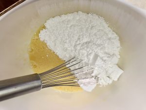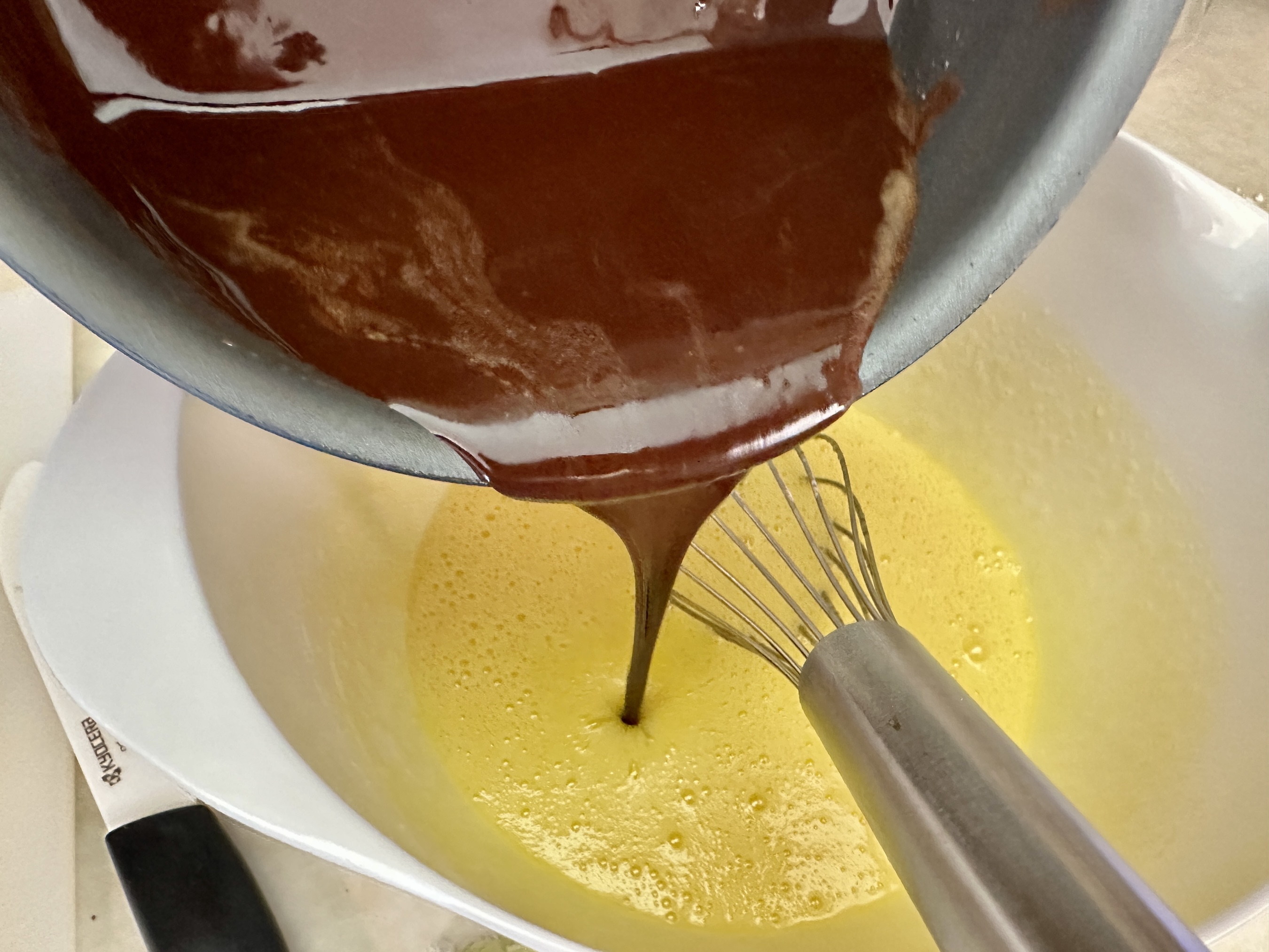 Whisk the eggs and egg yolks in a large bowl. Mix in the powdered sugar. Add the chocolate mixture and mix again. Finally, add the flour and mix until all ingredients are well combined.