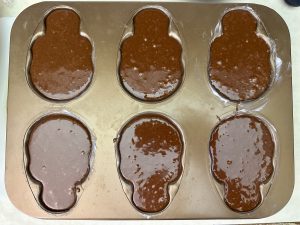 Evenly divide the batter between the skull molds. There might be a little extra batter, depending on how deep the skull wells are. You can bake a second batch or discard.