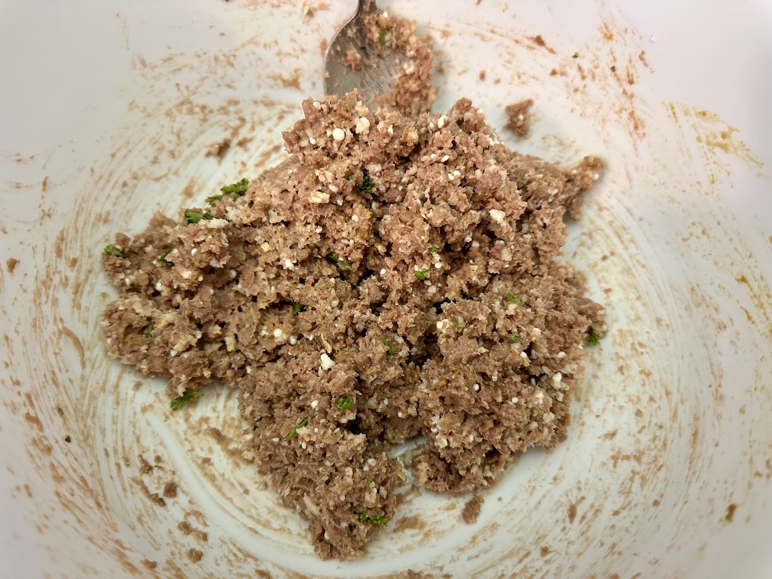 Combine the breadcrumbs and unsweetened almond milk in a small bowl. Combine the Beyond Meat, soy sauce, nutritional yeast, parsley, garlic, Italian seasoning, coriander, minced onion, garlic powder, salt, and pepper in a separate mixing bowl. Mix until well combined then add the breadcrumb mixture and mix again.