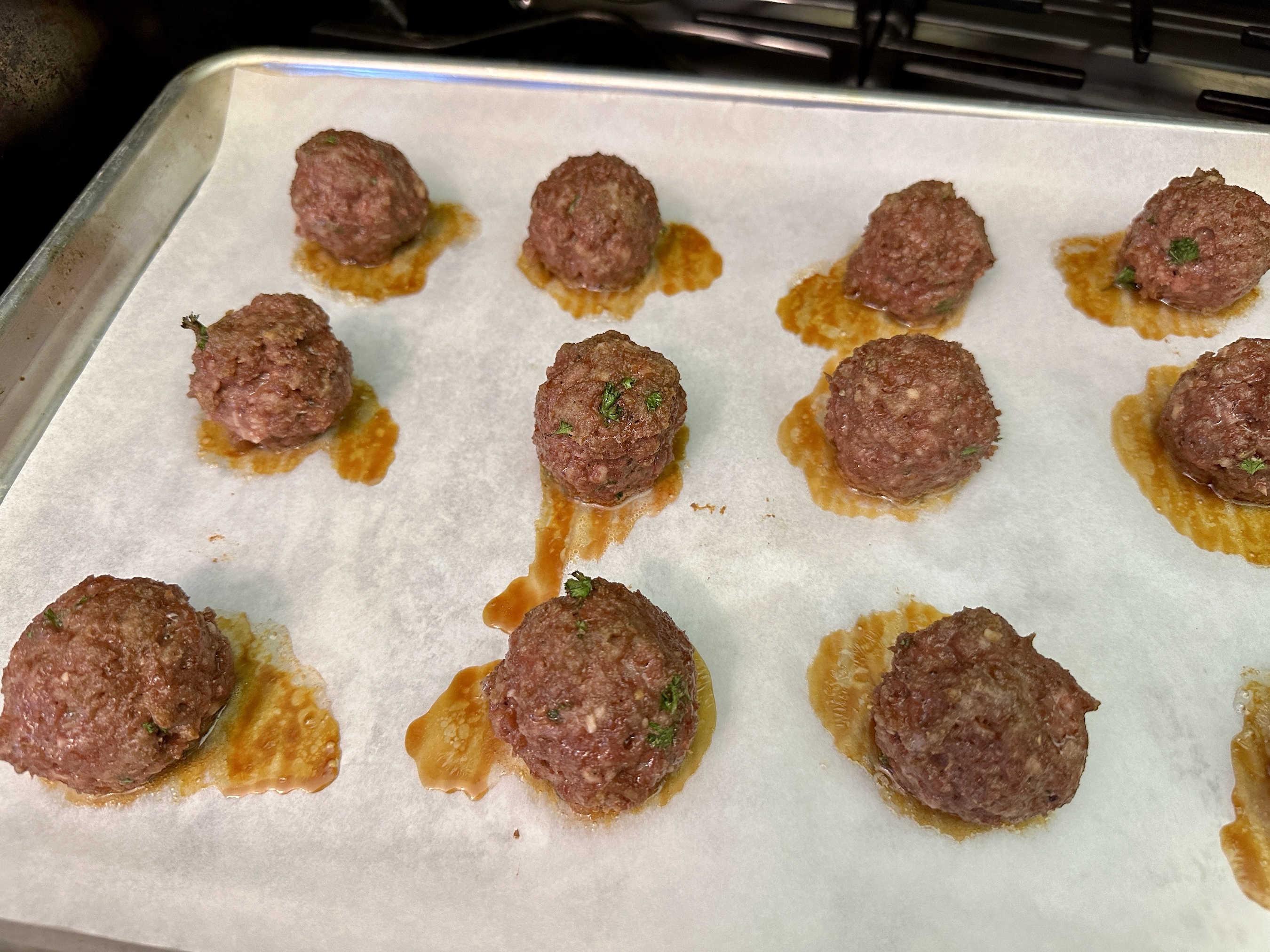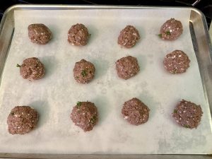 Divide the mixture into 12 meatballs, roll into a round shape, and place on the baking sheet, spaced apart. I find it easiest to use a cookie scoop for this step.