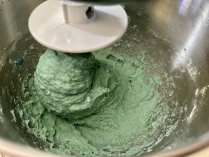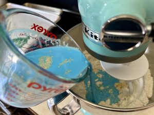 Start by making the Blue Milk Buns. Combine the milk and food coloring in a bowl – stir well to combine. Then, pour into the bowl of a stand mixer. Add the package of instant yeast and stir to combine.