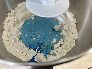 Add the flour, sugar, salt, egg, and melted butter. Use the dough hook to slowly mix the ingredients together until a ball forms – it will be sticky!