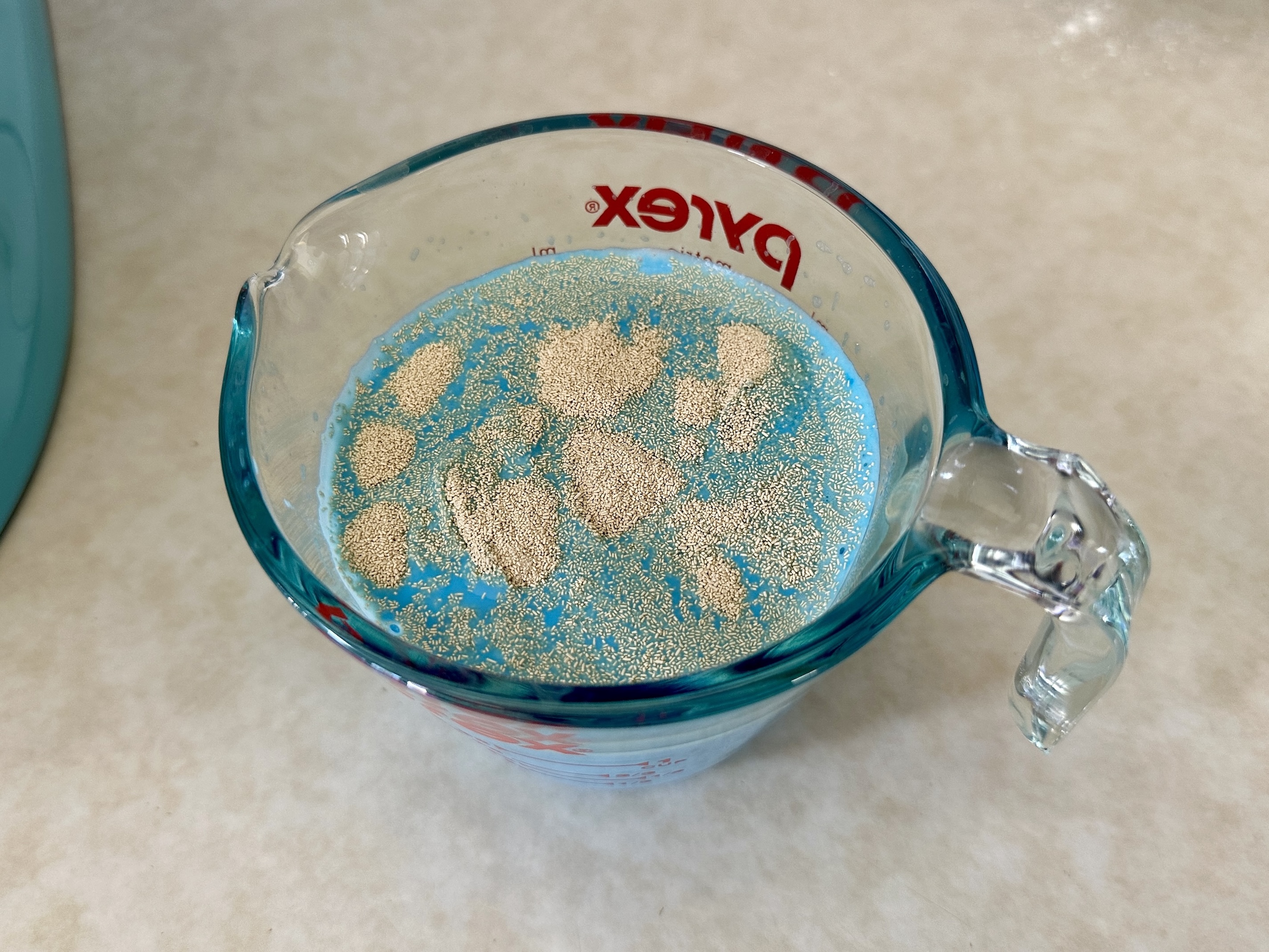 Start by making the Blue Milk Buns. Combine the milk and food coloring in a bowl – stir well to combine. Then, pour into the bowl of a stand mixer. Add the package of instant yeast and stir to combine.