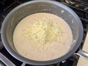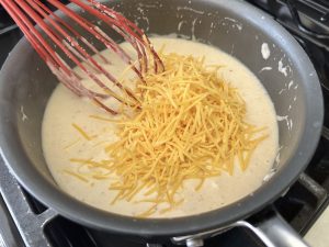Add the cheese: Reduce the heat to low and slowly whisk in the shredded cheddar and mozzarella until completely melted and smooth.