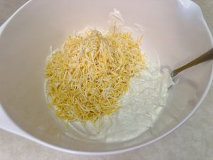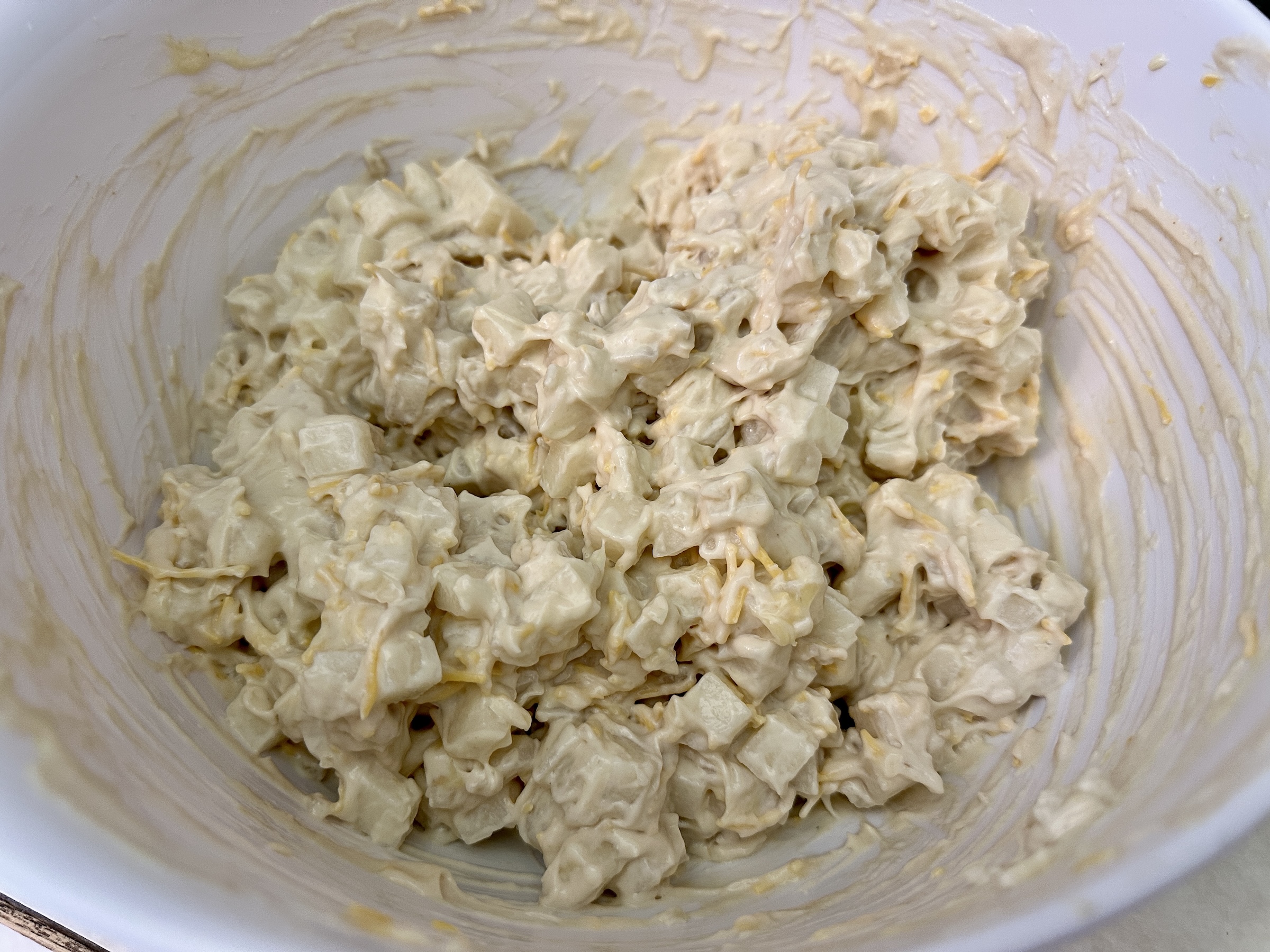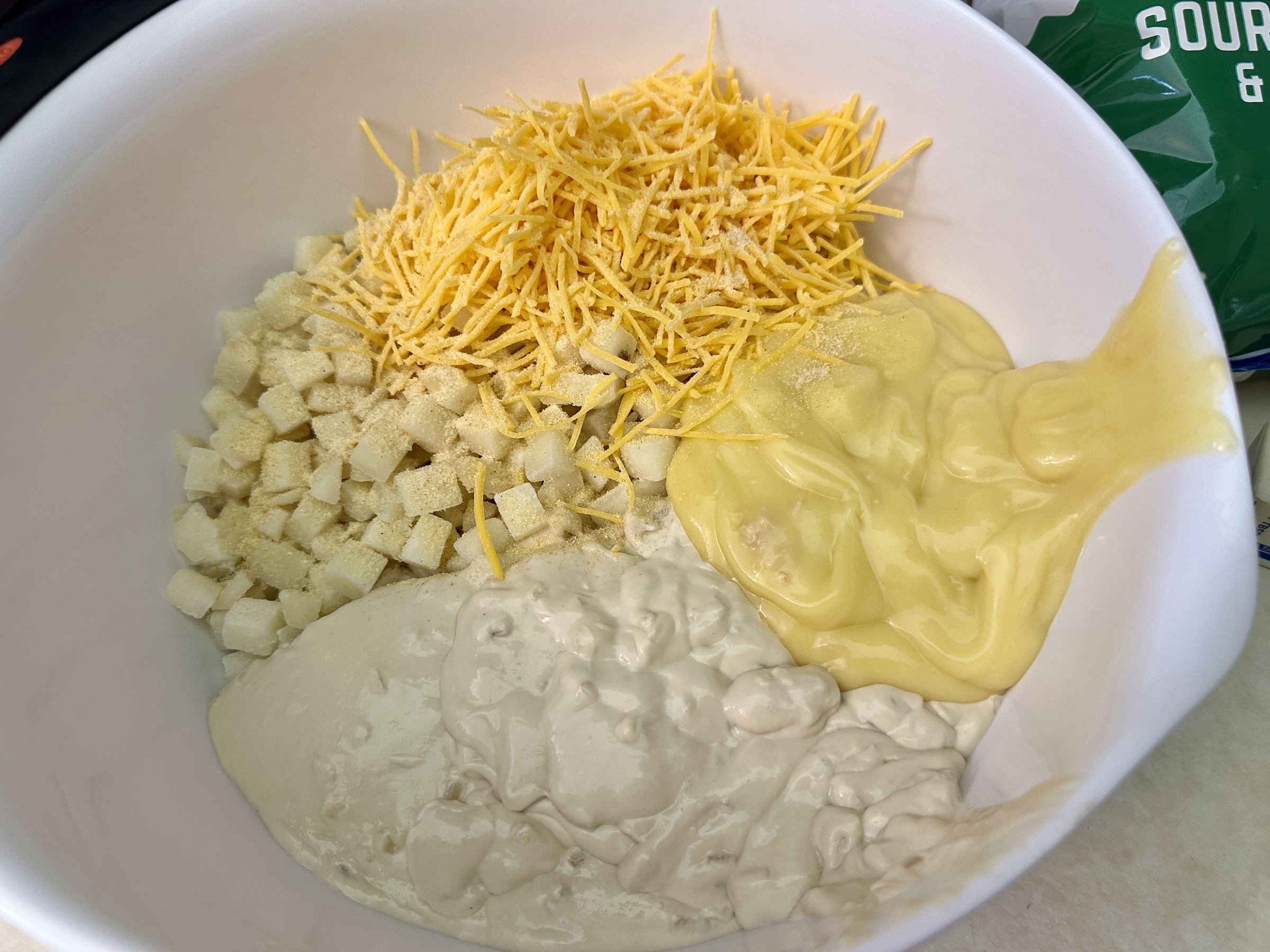 Mix the base: In a large mixing bowl, combine the frozen diced hash browns, French onion chip dip, cream of chicken soup, garlic powder, onion powder, and half of the shredded cheddar cheese. Stir until everything is well combined and evenly coated.