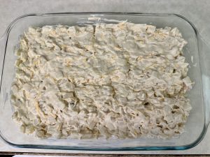 Assemble in the dish: Pour the mixture into the prepared baking dish and spread it out in an even layer.