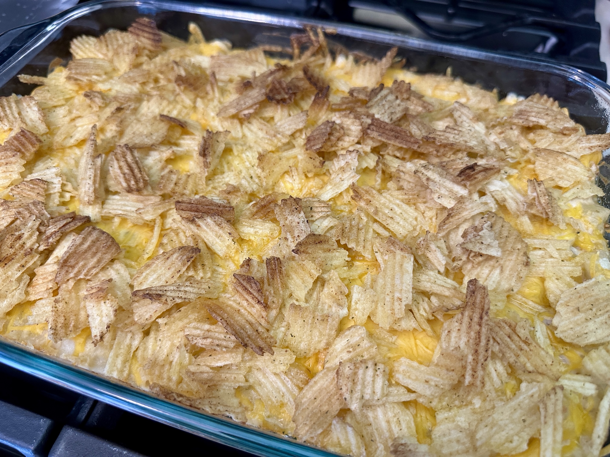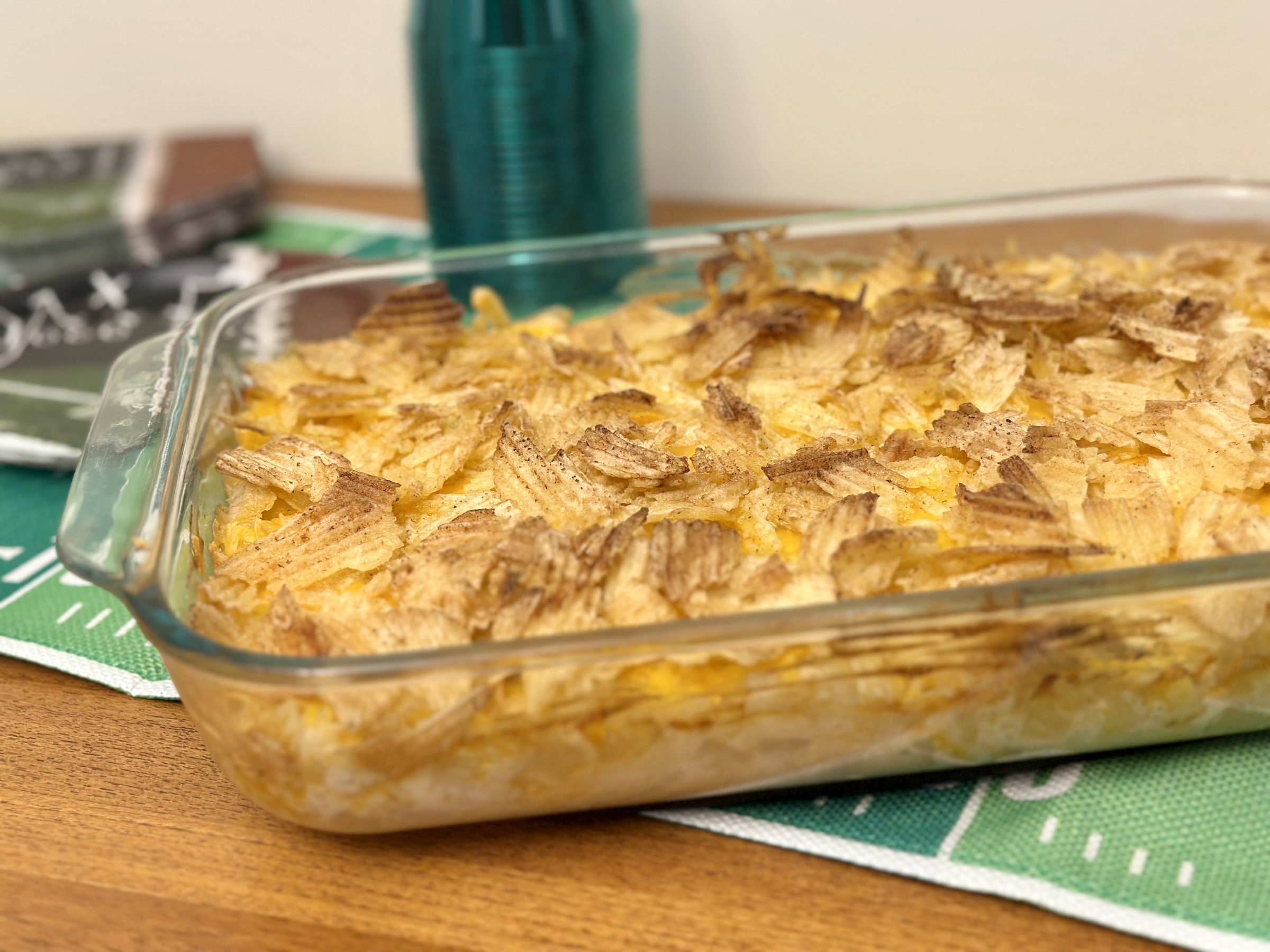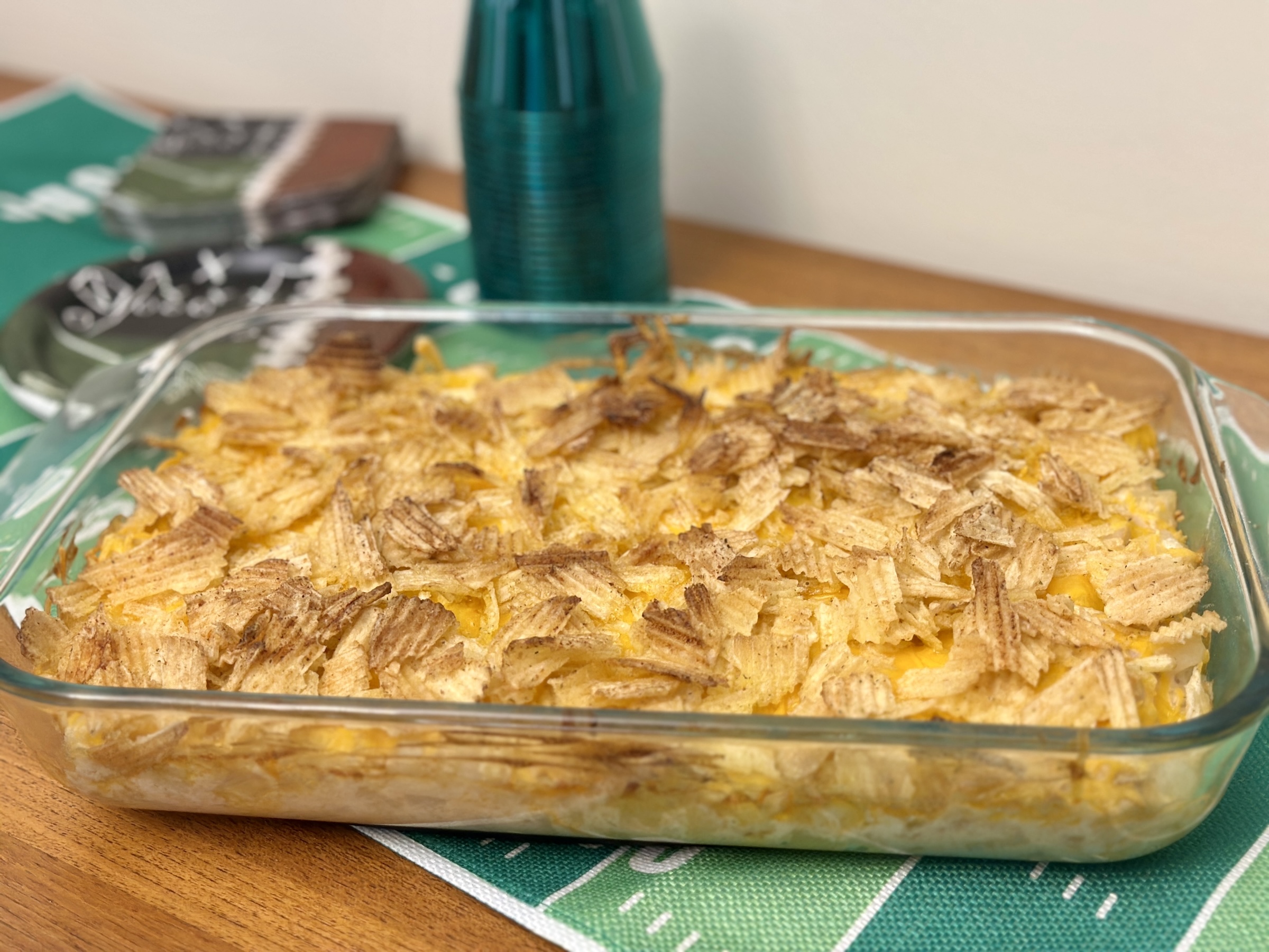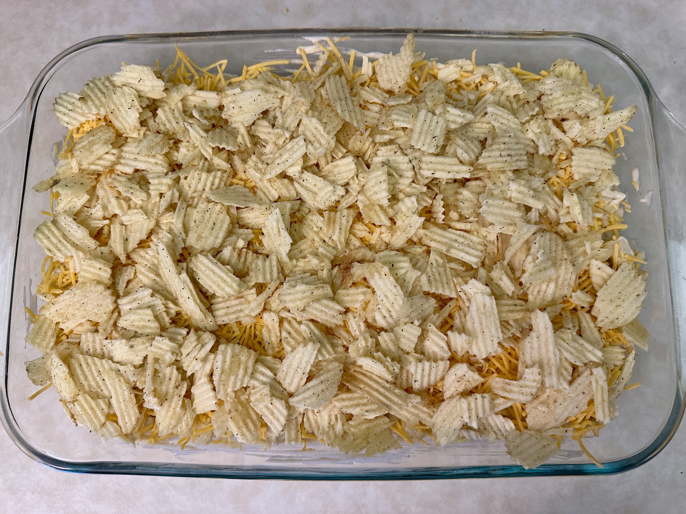 Add the crunchy topping: Remove the dish from the oven and sprinkle the crumbled Ruffles Sour Cream & Onion Chips over the top.