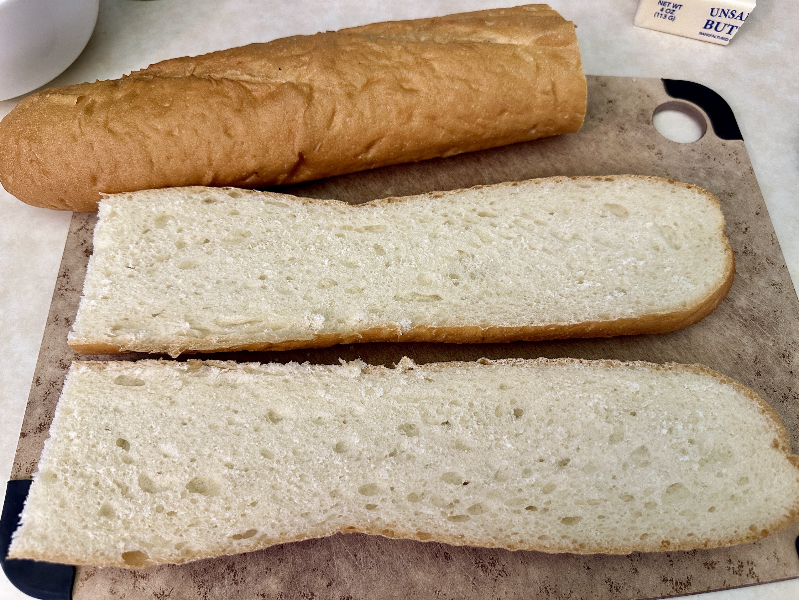Prep the bread: Slice the French bread in half widthwise. If using one long loaf, cut each half lengthwise; if using two shorter loaves, simply slice each in half lengthwise. Set the pieces aside.