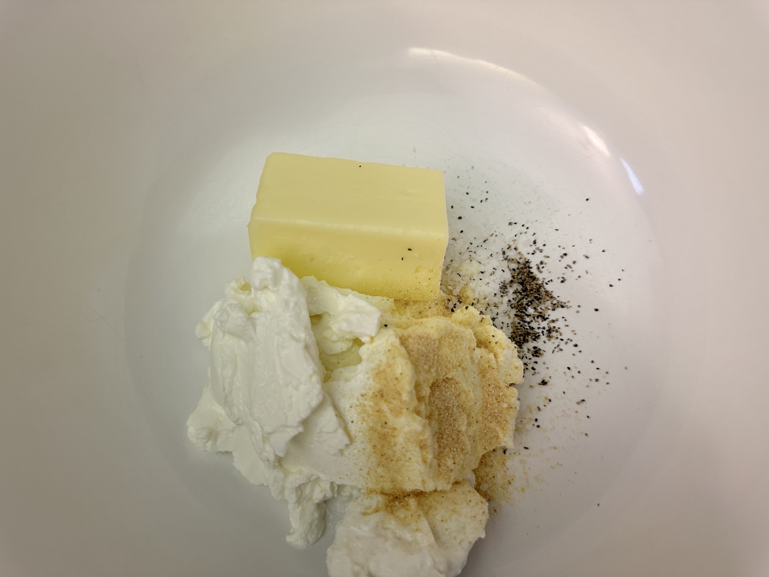 Make the cheesy mixture: In a large bowl, combine the sour cream, softened butter, and garlic powder. Season with salt and black pepper to taste.