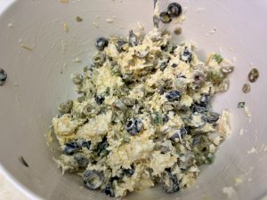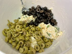 Mix in the olives: Gently fold in the drained green and black olives so they’re evenly distributed throughout the mixture.