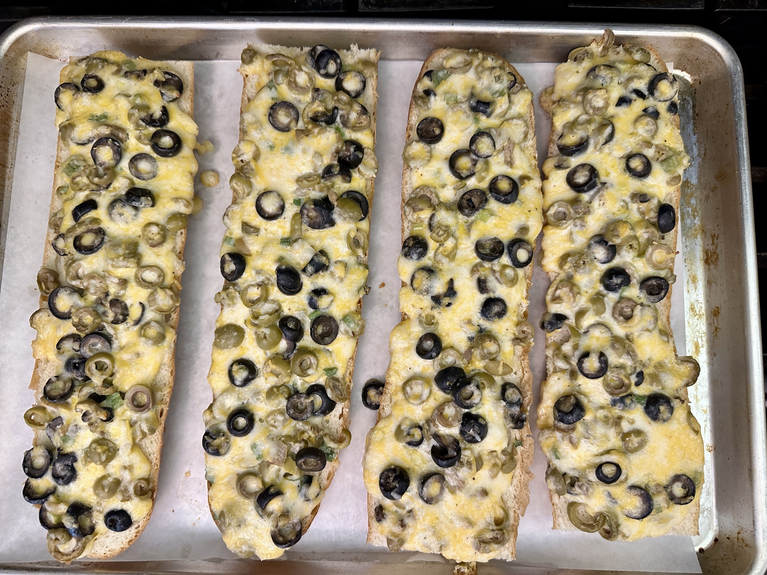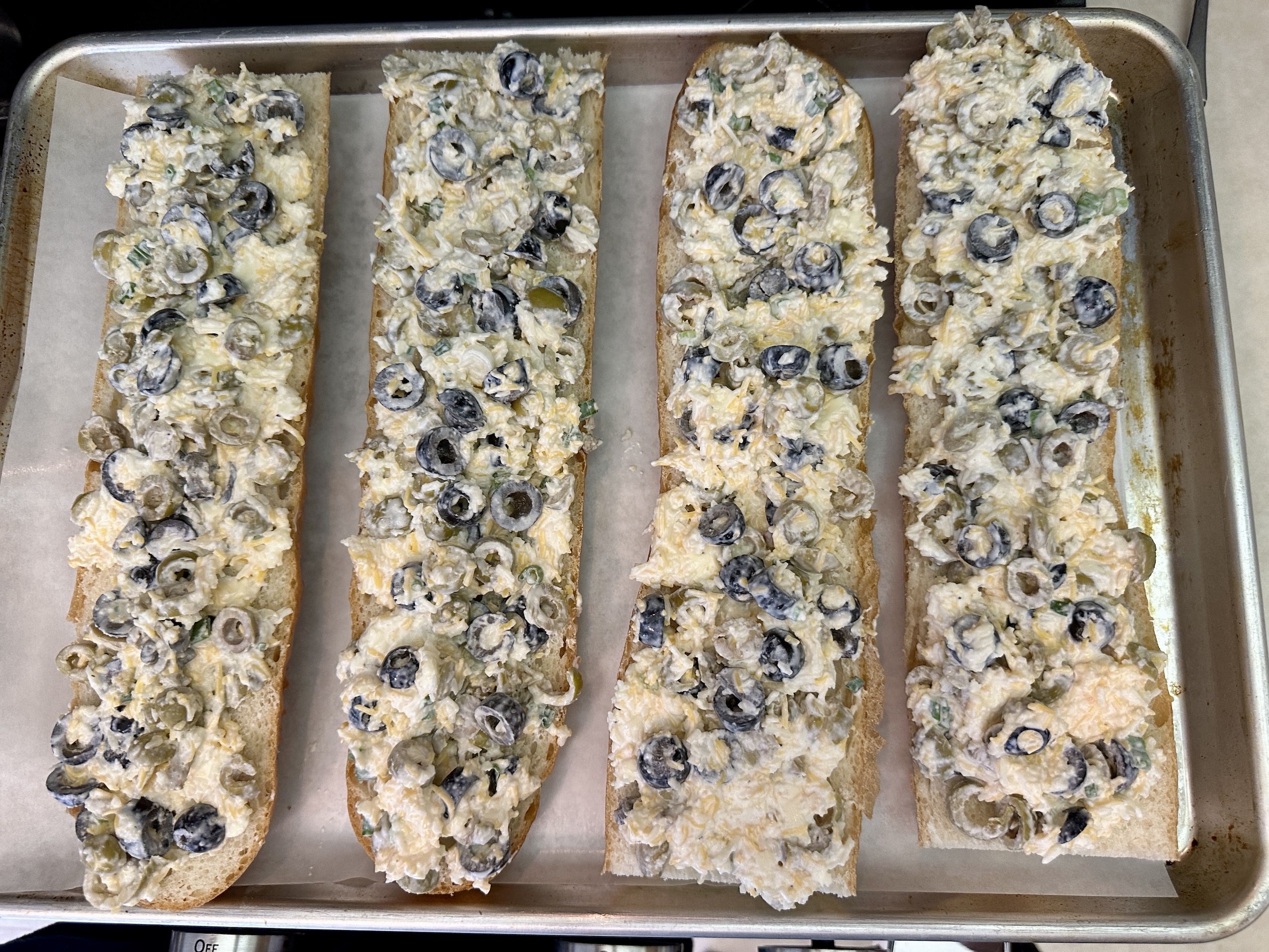 Assemble the bread: Divide the cheesy olive mixture evenly among the prepared bread pieces, spreading it generously over the tops.