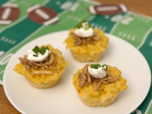 Let’s start with Loaded Mac & Cheese Cups. No game day is complete without a cheesy, comforting snack and these deliver exactly that. Creamy, cheesy macaroni is baked into individual cups and piled high with all the best toppings—fresh green onions, a dollop of sour cream, and crispy fried onions for the perfect crunch. They’re easy to grab, totally irresistible, and guaranteed to be the star of your football spread!