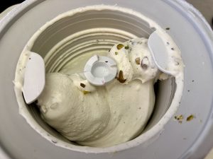 Once chilled, pour the mixture into an ice cream maker and churn according to manufacturer instructions. When close to being done, add the chopped pistachios and rose petals and churn until evenly distributed.