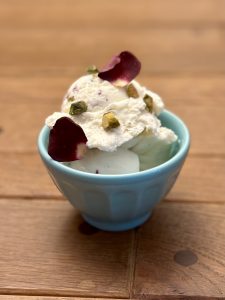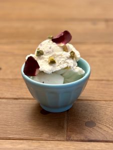 When ready to serve, scoop into bowls and garnish with additional pistachios and rose petals. Enjoy!
