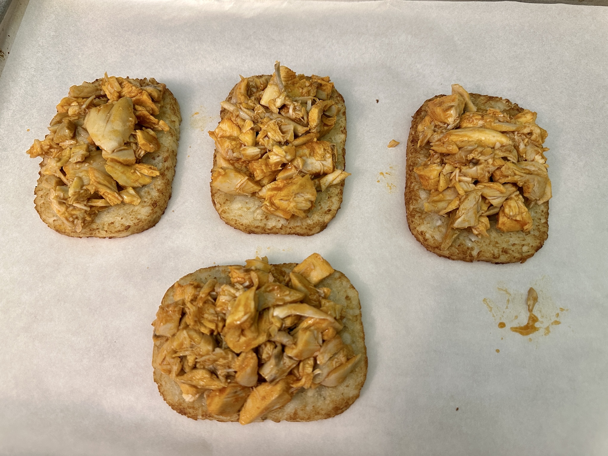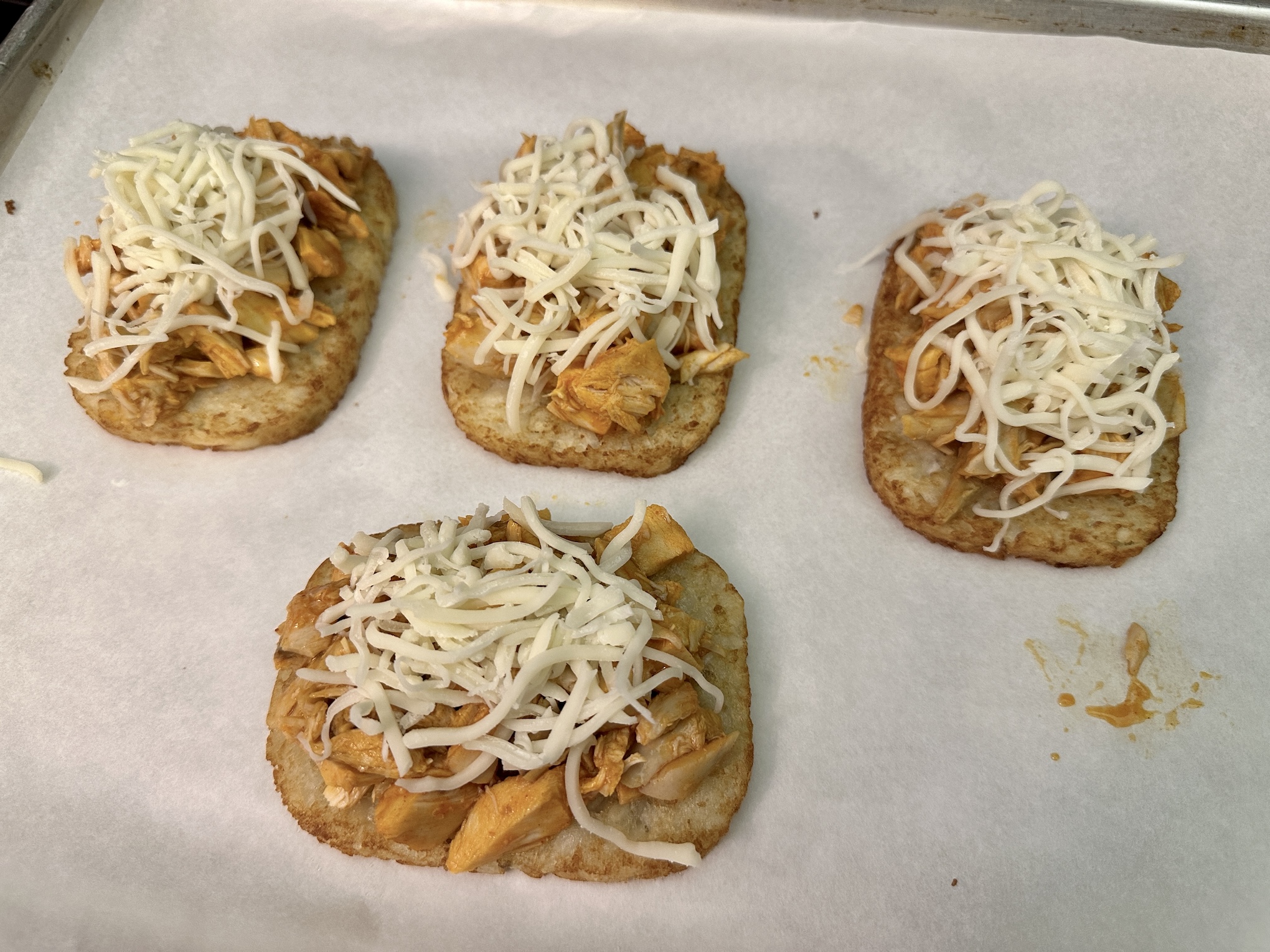 Evenly divide the buffalo mixture between the hashbrowns. Top with shredded mozzarella and return to the oven for a few minutes to melt the cheese.