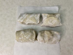 Start by laying the egg roll wrappers on the counter in a diamond shape. You should lay out however many wrappers you plan to make – you can make one or many. It really depends on how many leftovers you have and if you want to exhaust all the leftovers as egg rolls.