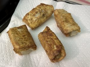 Heat the oil in a shallow fry pan. Once hot, add the egg roll(s) and fry until crispy, about 8-10 minutes. Make sure to rotate every few minutes to crisp all sides and heat the ingredients but don’t overcrowd the pan. Only add 2-4 egg rolls at a time, depending on how big the egg rolls and pan are.