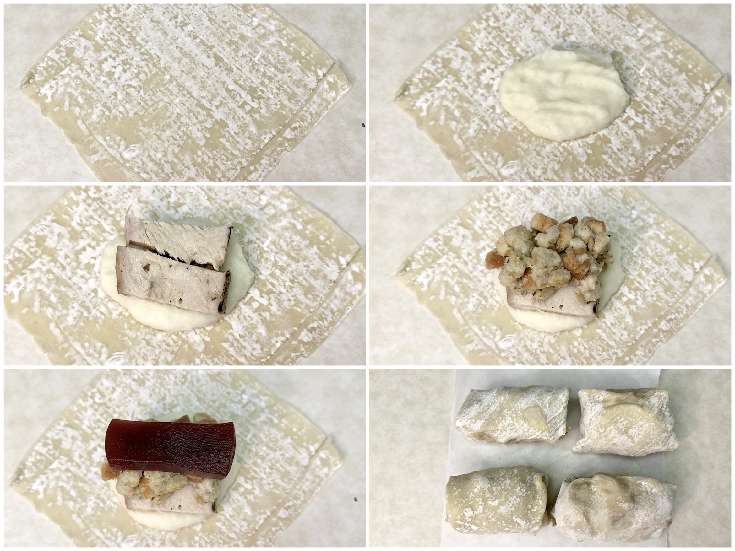 Next, add a slice of turkey, then a spoonful of stuffing, and top with a piece of cranberry sauce.